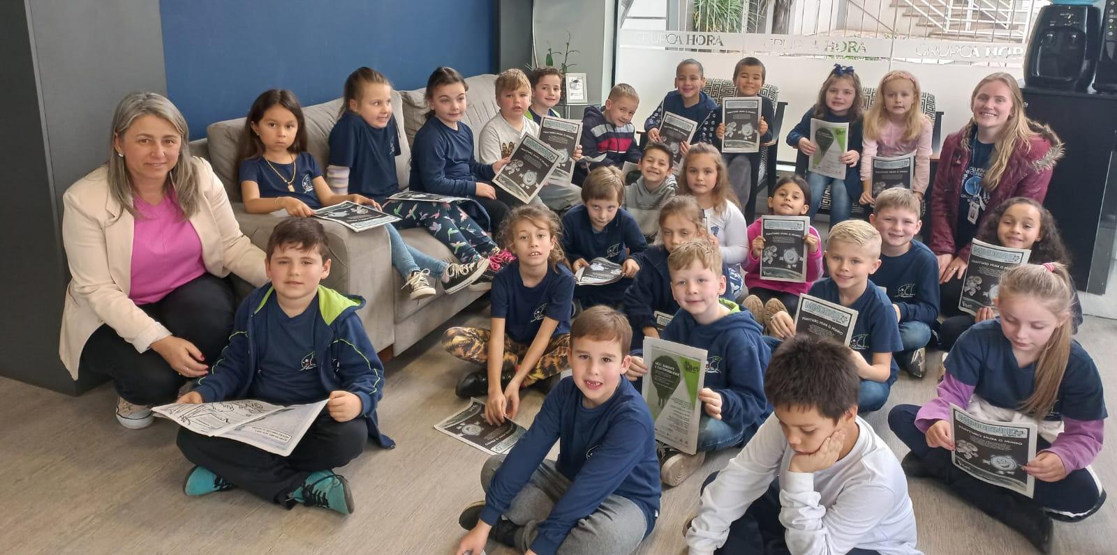 A Hora 102.9, a redação e demais setores. “Como a turminha está encantada com o mundo letrado, explorar a escrita e leitura a partir de um meio de comunicação foi