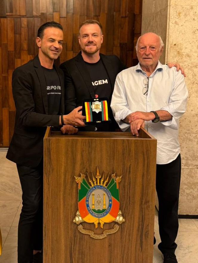 Ao lado de um dos maiores empreendedores da história do Rio Grande do Sul, o porto-alegrense Jorge Gerdau, o pré-candidato a deputado estadual Roberto Lucchese (MDB) foi agraciado com a Medalha do Mérito Farroupilha, a distinção máxima da Assembleia Legislativa do Rio Grande do Sul concedida a quem contribui de forma significativa ao desenvolvimento econômico, social e cultural do estado gaúcho. Ele recebeu o prêmio ao lado de outros líderes estaduais que estão por detrás do Grupo Front, responsável por diversas ações de reconstrução e remobilização após as tragédias de 2023 e 2024. Entre essas, claro, destaque à reconstrução da Ponte de Ferro, entre Lajeado e Arroio do Meio, além de 65 moradias em Arroio do Meio e Muçum. “É a primeira vez que um grupo, e não uma pessoa, recebe este reconhecimento”, observa Lucchese.