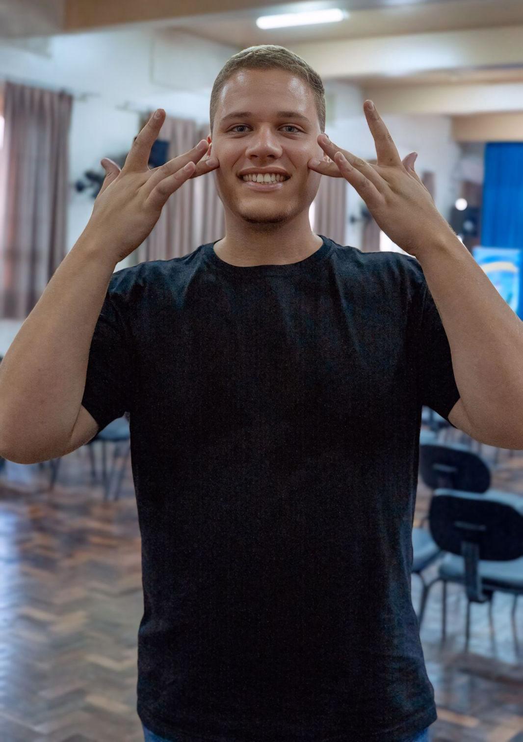 Thales MoreiraThiesen, 29 anoséintérpreteeinstrutor de Libras. Ele vê sua formaçãoetrabalhocomo umcompromissosocial.