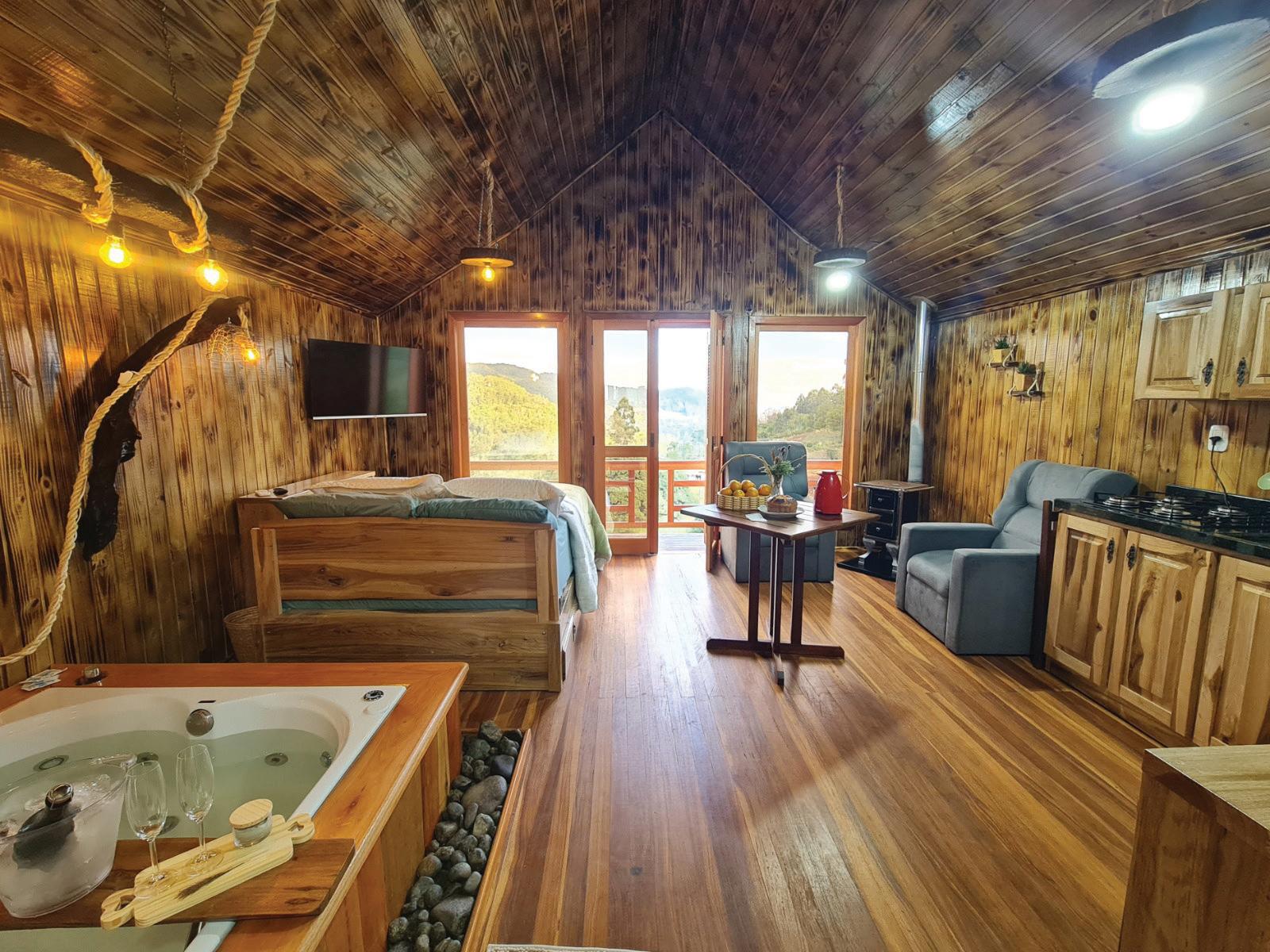 Na parte interna, a hospedagem é formada por peça única. Tem cozinha completa, fogão a lenha ao lado de duas poltronas confortáveis e cama de casal com colchão de apoio para mais uma pessoa. O destaque fica para a hidromassagem.