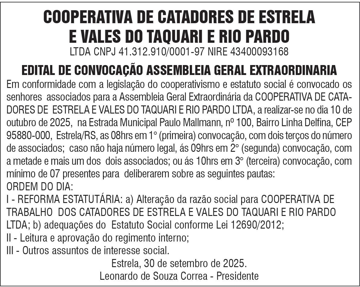 - A Comissão Externa da Câmara dos Deputados, que trata dos danos das enchentes no RS, realiza evento no dia 17 de outubro, na câmara de Estrela. E por lá estarão os deputados federais Marcel Van Hatten (Novo), coordenador da comissão, e Pompeo de Matos (PDT), o relator.