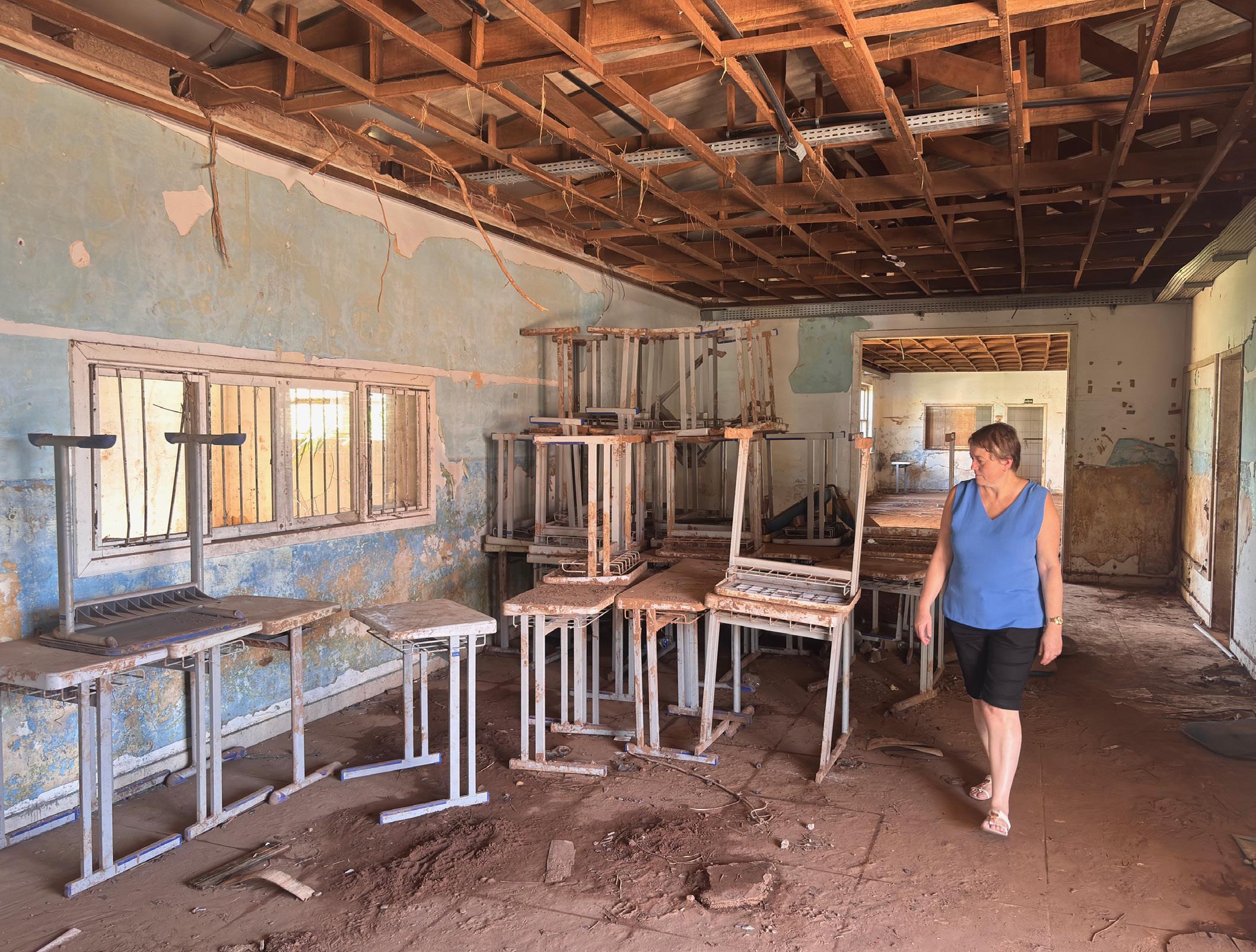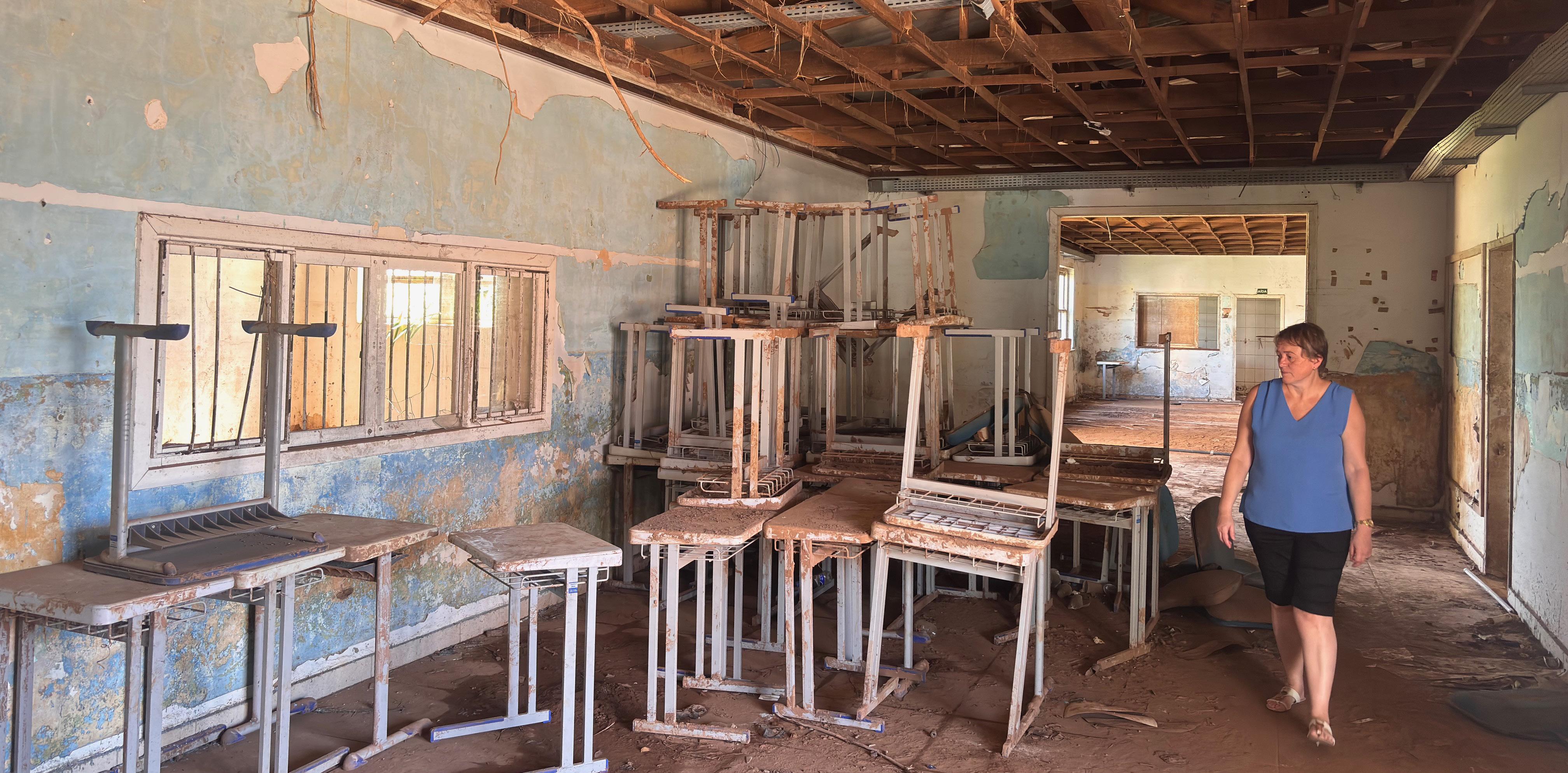 Ex-diretora da Antônio de Conto, Vanessa Gianezini, entre os escombros da escola. O processo acelerado de degradação compromete a segurança, estrutura e salubridade criando riscos para a vizinhança