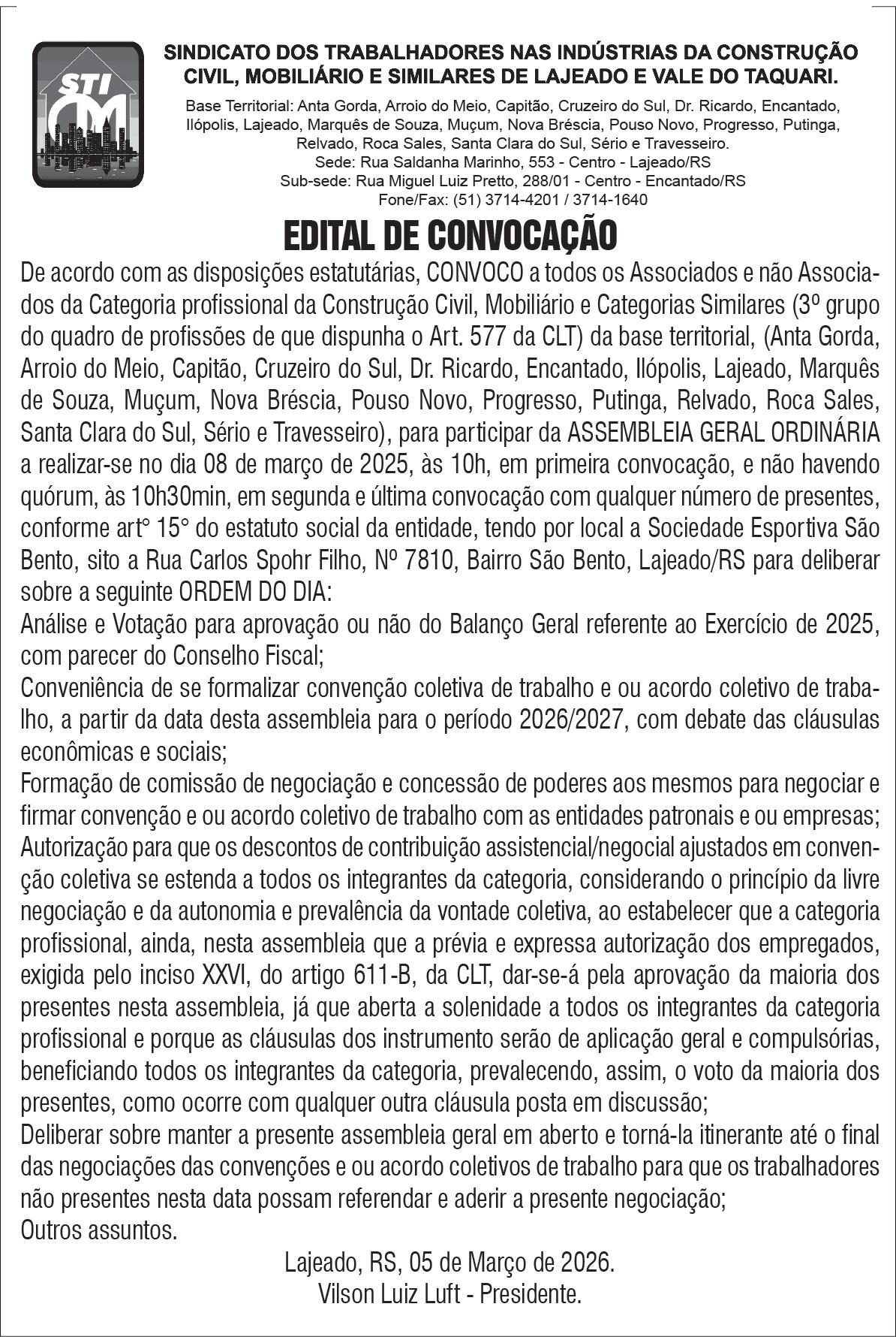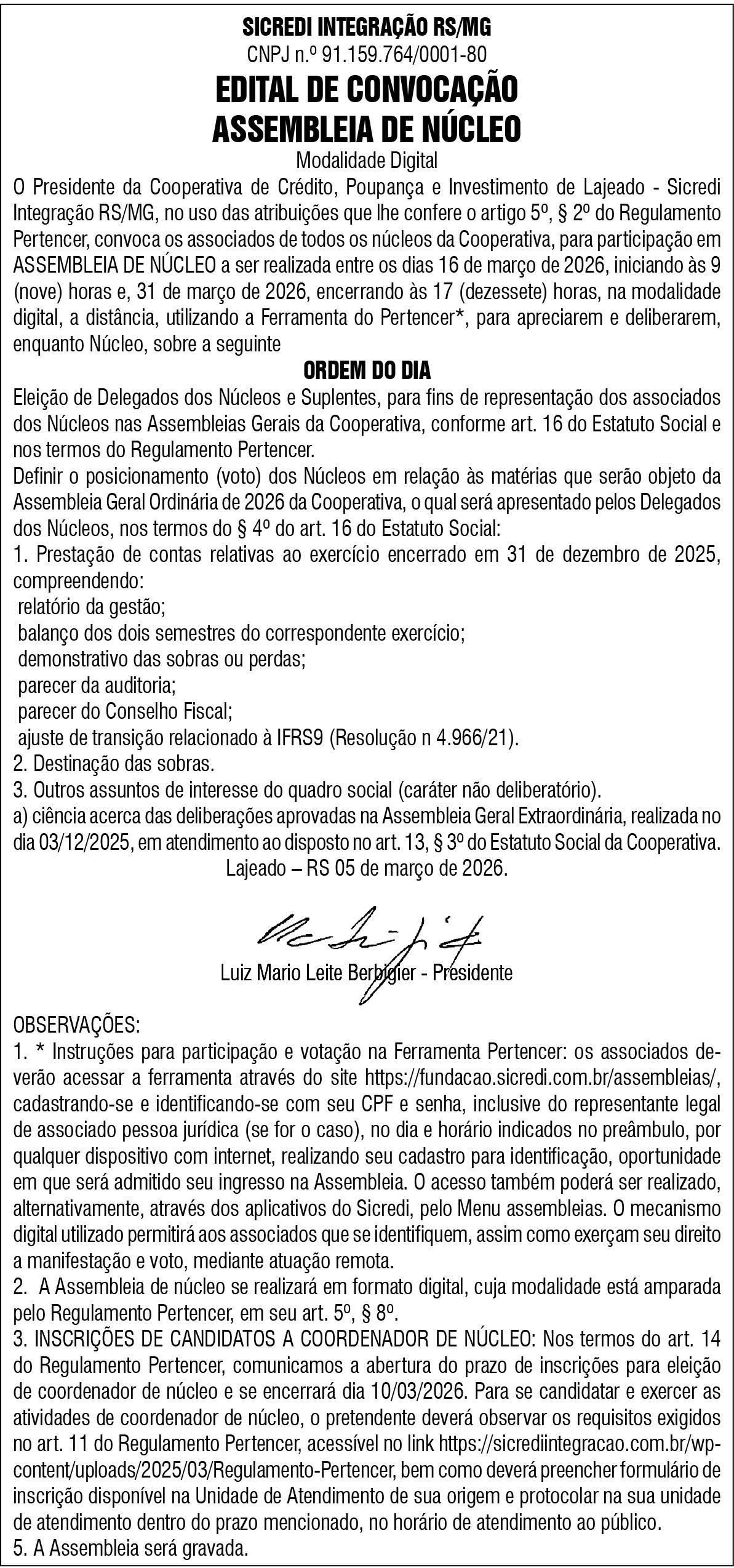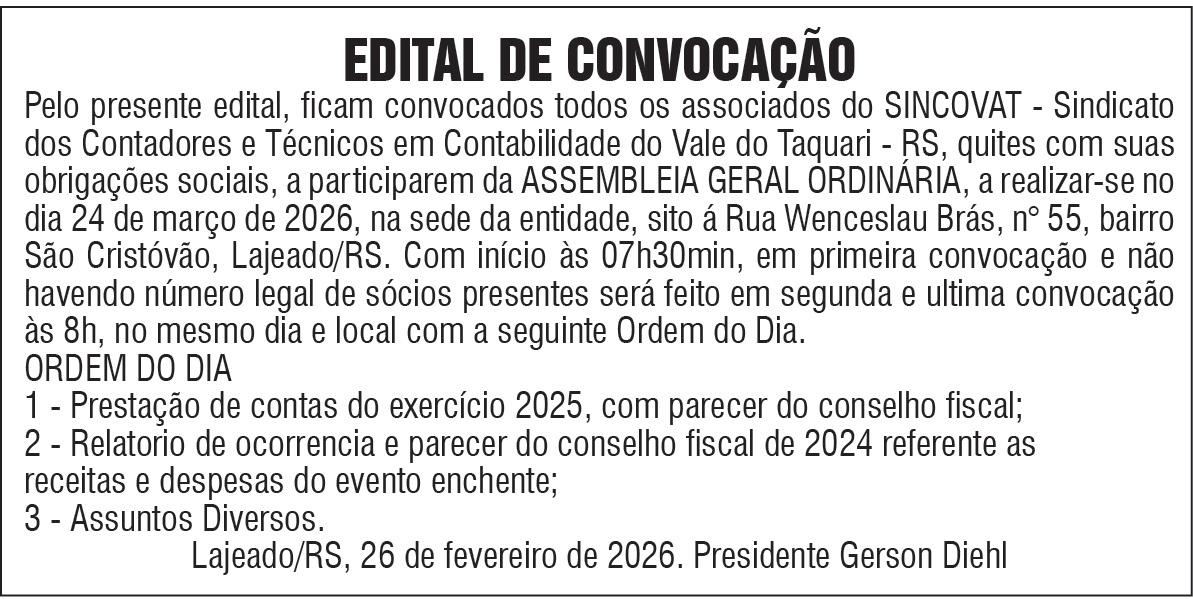 Conforme o edital de convocação, a pauta inclui a prestação de contas do exercício de 2025, o parecer do Conselho Fiscal, o relatório de atividades, a apresentação da Diretoria Executiva 2026 e do Planejamento Estratégico para o ano.