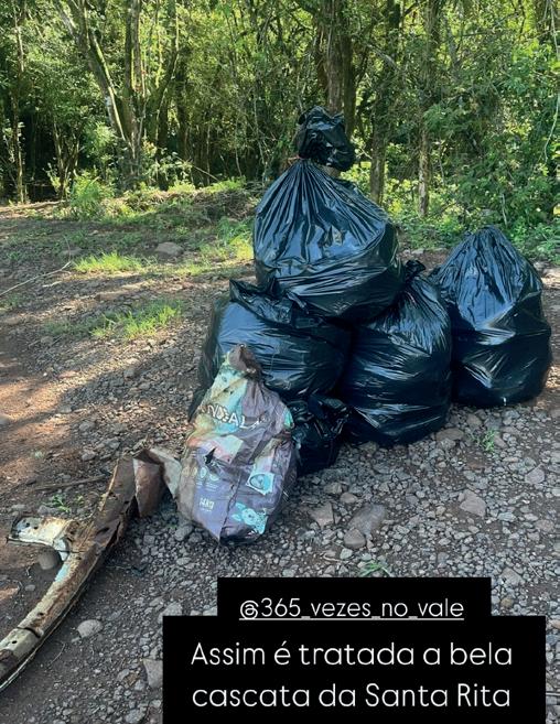 Postamos um vídeo da Cascata Santa Rita no Instagram do @365_vezes_no_ vale. Boa parte dos comentários tratava da sujeira deixada no local. O relato mais impressionante veio do morador próximo, Anderson Kilpp. Num sábado de manhã, ele recolheu mais de cinco sacos de 100 litros cheios de lixo.