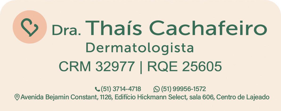 Thaís Cachafeiro é dermatologistaformada pelaUFRGS.Naturalde PortoAlegreecrescida noVale dos Sinos, atua comfocoematualização constante, cuidado humanizado e tratamentos quepromovemsaúdee autoestima