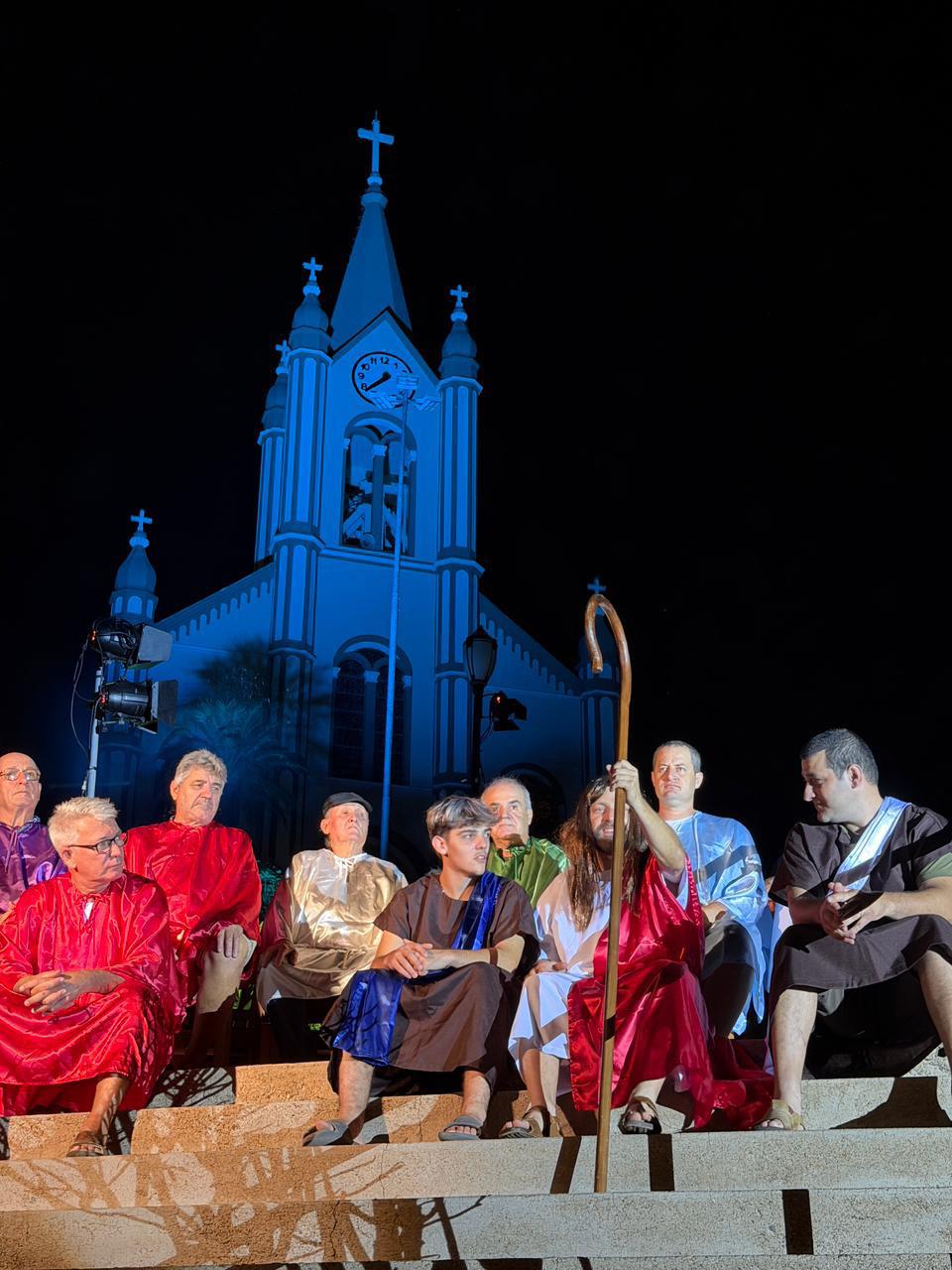 programação iniciou com apresentações dos corais São Carlos e Vida e Canto. Ao final, crianças distribuíram mini terços ao público. O coordenador Gustavo Luis Bagatini destacou o caráter coletivo e voluntário do trabalho. Em Muçum, o espetáculo foi ampliado para dois dias e reuniu mais de sete mil pessoas na Praça da Matriz. A encenação apresentou mudanças na narrativa e novas cenas, buscando renovar a experiência do público. A abertura, com inversão cronológica, foi um dos destaques. A produção também investiu em iluminação e sonorização para intensificar a ambientação.