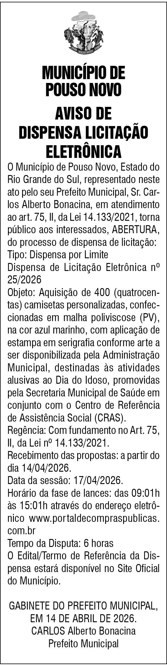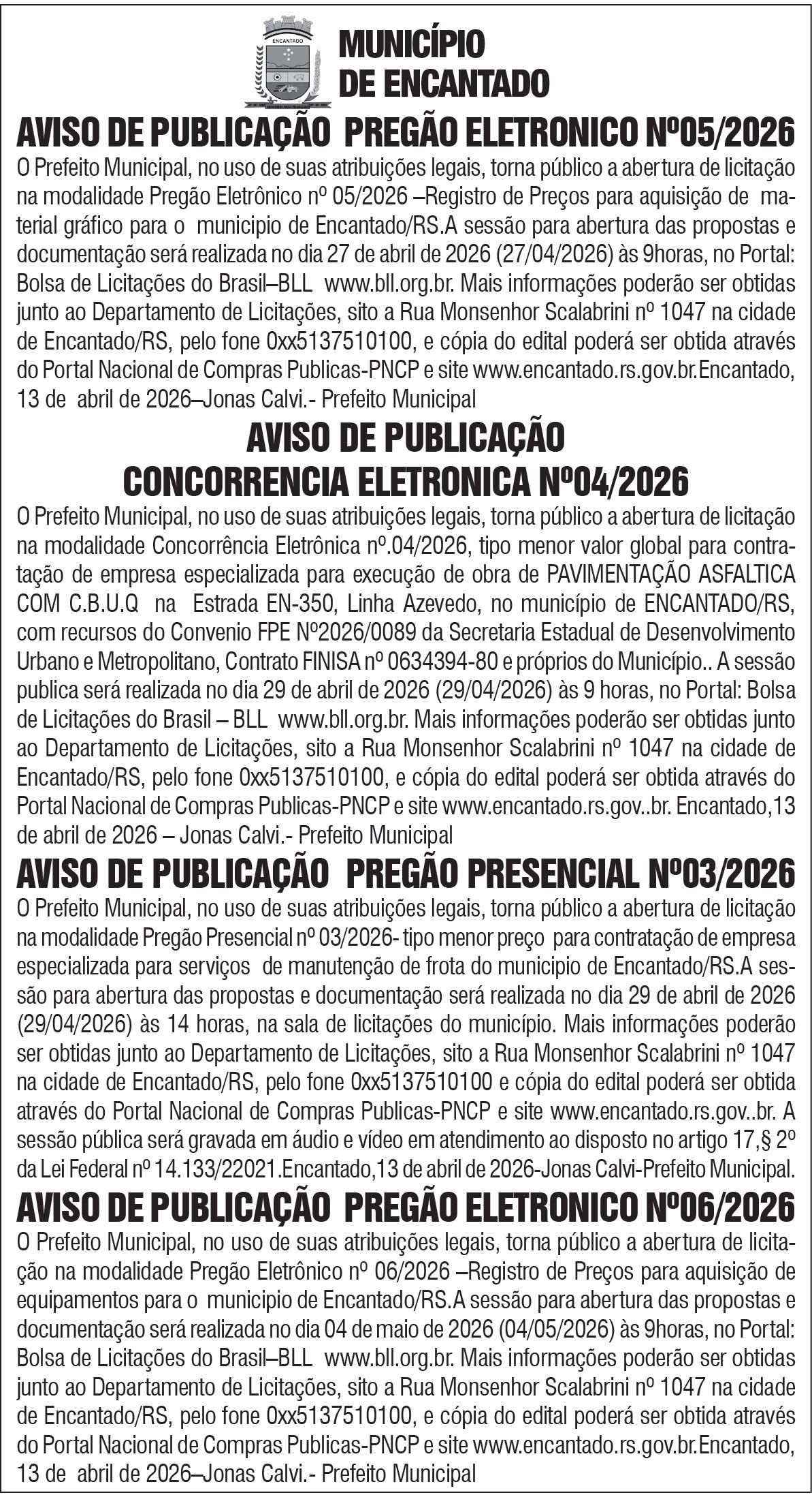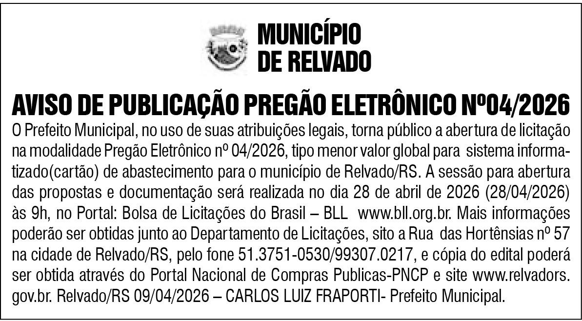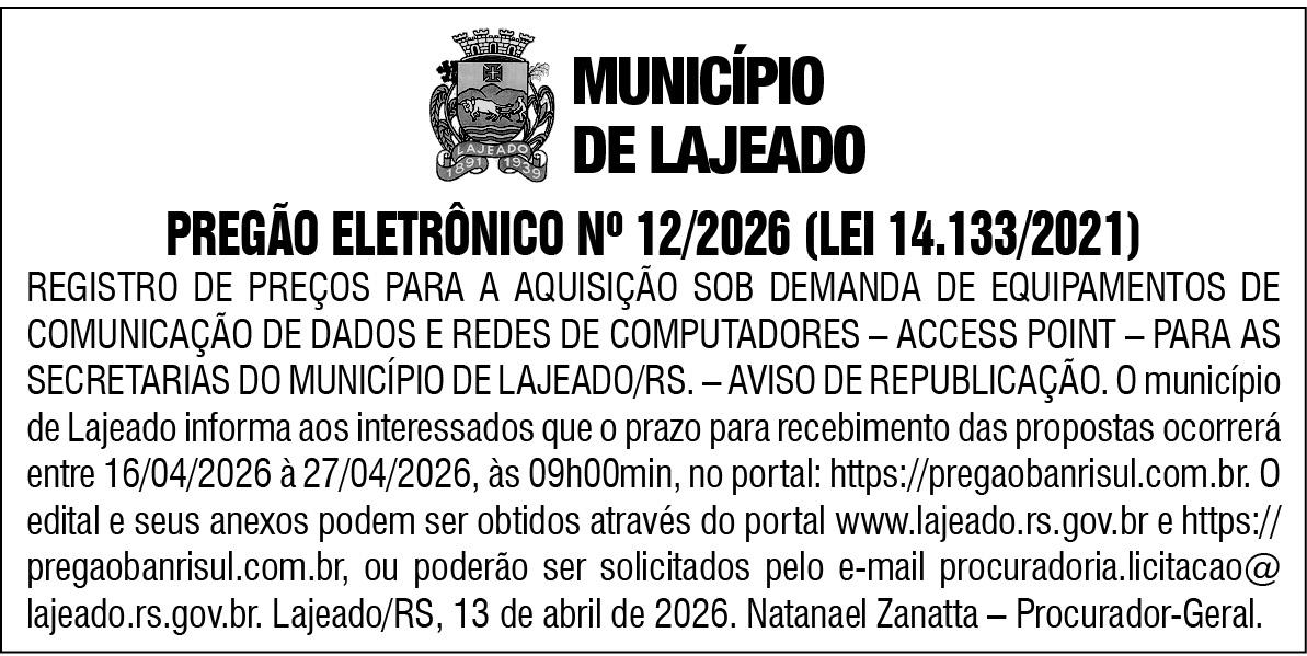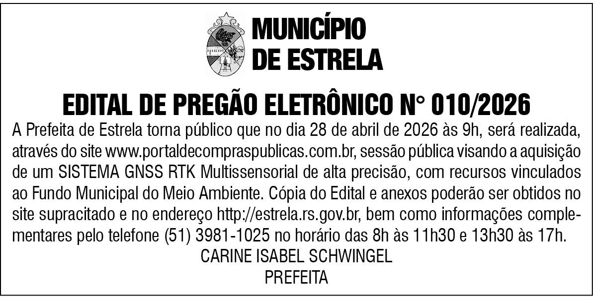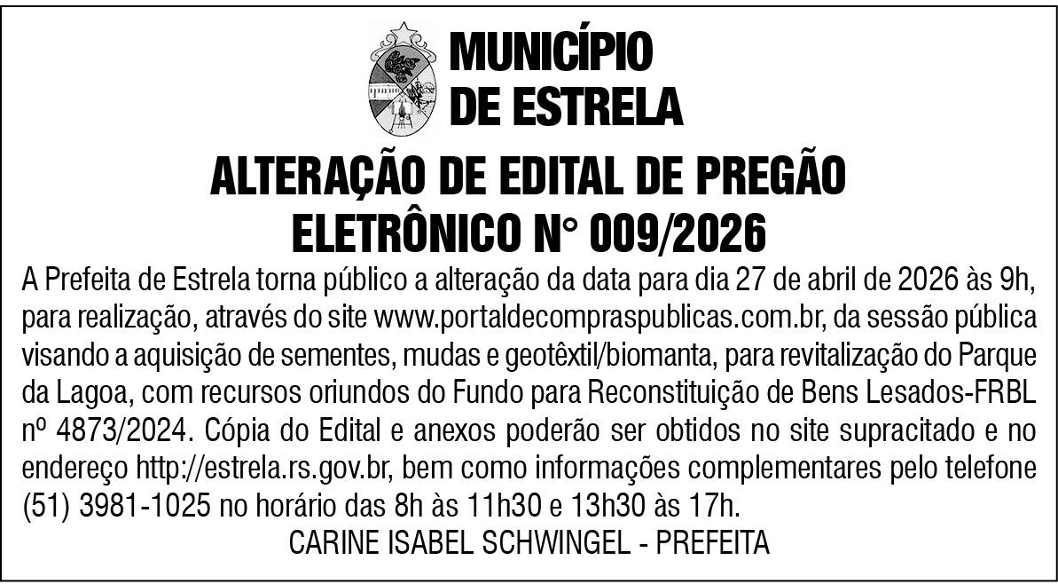 - O governo de Estrela realiza no dia 24 de abril a sessão pública para a aquisição de sementes, mudas e biomanta necessárias à revitalização do Parque da Lagoa. Os recursos são do Fundo para Reconstituição de Bens Lesados (FRBL).
