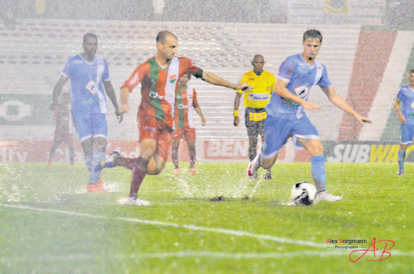 Em casa, o Passo Fundo tomou a iniciativa no início do confronto. A primeira boa chegada foi de Álisson Gaúcho, que se livrou da marcação e do aguaceiro antes de tentar a finalização. A resposta alviazul veio na sequência, antes dos 15 minutos, com Alan Bald. Com o gramado encharcado, o jogo ficou truncado. Só aos 34 minutos a partida teve emoção novamente. Foi quando Matheus Cavichioli defendeu com os pés e evitou que o Alviazul abrisse o placar. A etapa complementar começou da mesma forma. Sem grandes possibilidades de conduzir a bola por causa da água, o jogo foi dominado por balões. Quando o time da casa foi ao ataque, Édson