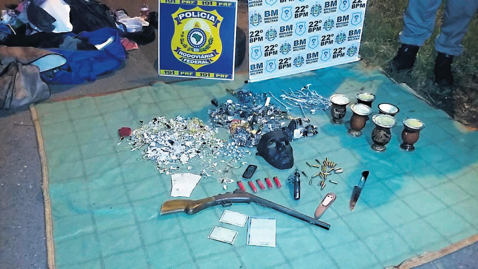 Ação conjunta da Polícia Rodoviária Federal (PRF) e Brigada Militar (BM) prendeu, à 1h30min de ontem, integrantes de uma quadrilha suspeita de assaltar uma joalheria no dia anterior em Roque Gonzales, no Noroeste do estado. Com o grupo, além de quase R$ 50 mil em joias, foram apreendidas uma espingarda calibre 16, um revólver calibre 38 e munições de ambos armamentos.