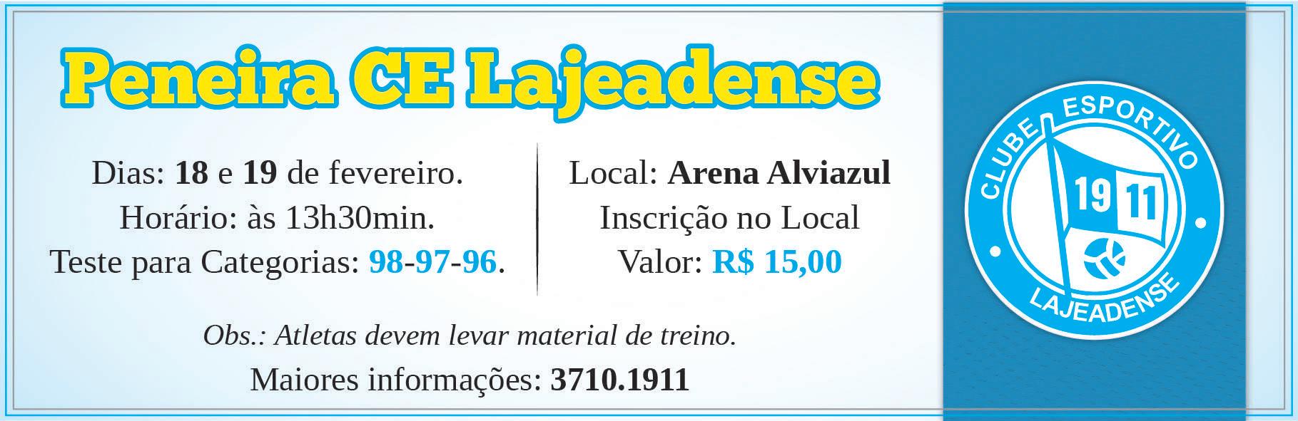 Visando o Estadual de Juniores, o Lajeadense promove nos dias 18 e 19 peneira para os atletas das categorias 96/97/98. Os interessados devem comparecer na Arena Alviazul munidos de material de treino. O valor da inscrição é de R$ 15. Mais informações pelo 3710-1911.