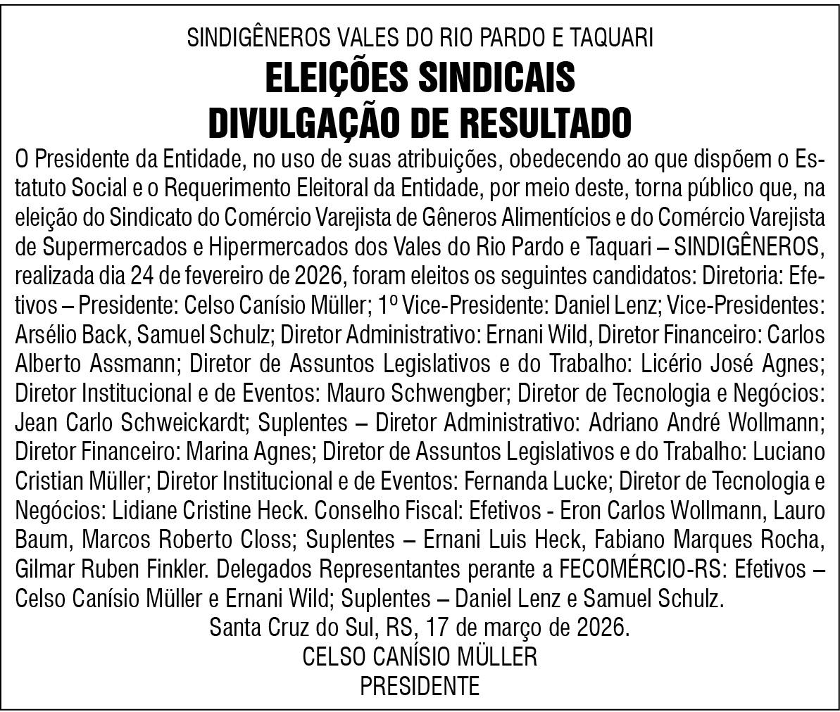 - Na edição do fim de semana, eu escrevi sobre um curioso almoço entre um ex-prefeito e um ex-vice prefeito que foram adversários no pleito de Estrela em 2020. O primeiro nome eu acertei: Elmar Schneider. O segundo, não. Escrevi Valdir Griebeler. E o correto, claro, é Valmor Griebeler.