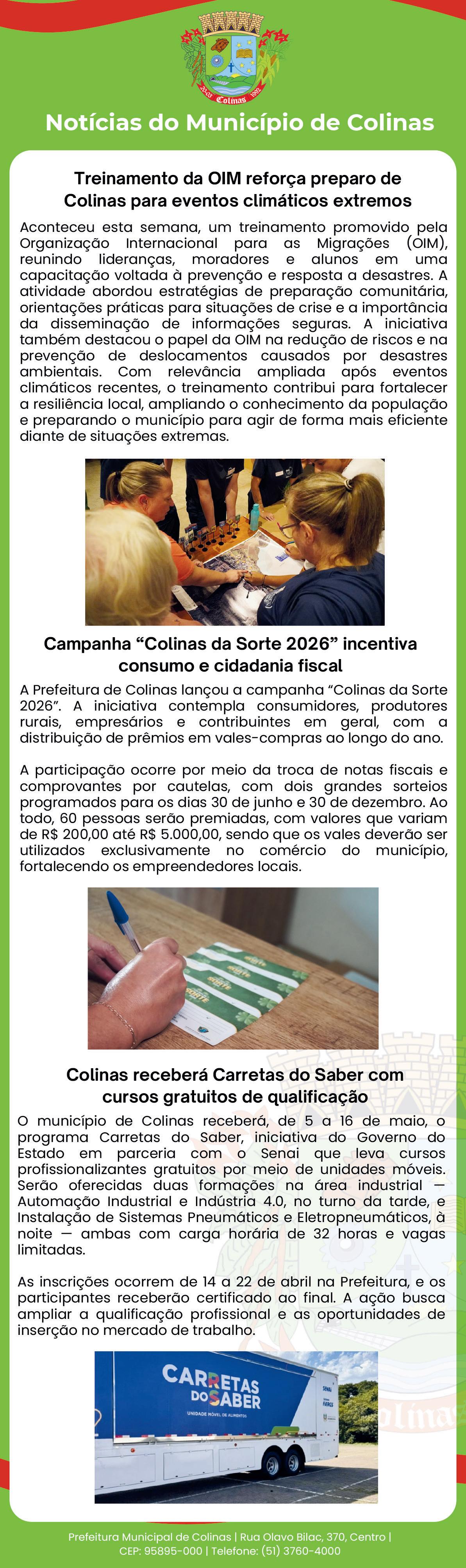 Em Colinas, serão oferecidos dois cursos gratuitos na área industrial, alinhados às demandas do mercado de trabalho. O curso de Automação Industrial e Indústria 4.0 ocorrerá de 5 a 15 de maio, de terça a sexta-feira, no turno da tarde, das 13h às 17h, com carga horária de 32 horas. Já o curso de Instalação de Sistemas Pneumáticos e Eletropneumáticos será realizado no mesmo período, no turno da noite, das 18h às 22h, também com 32 horas.