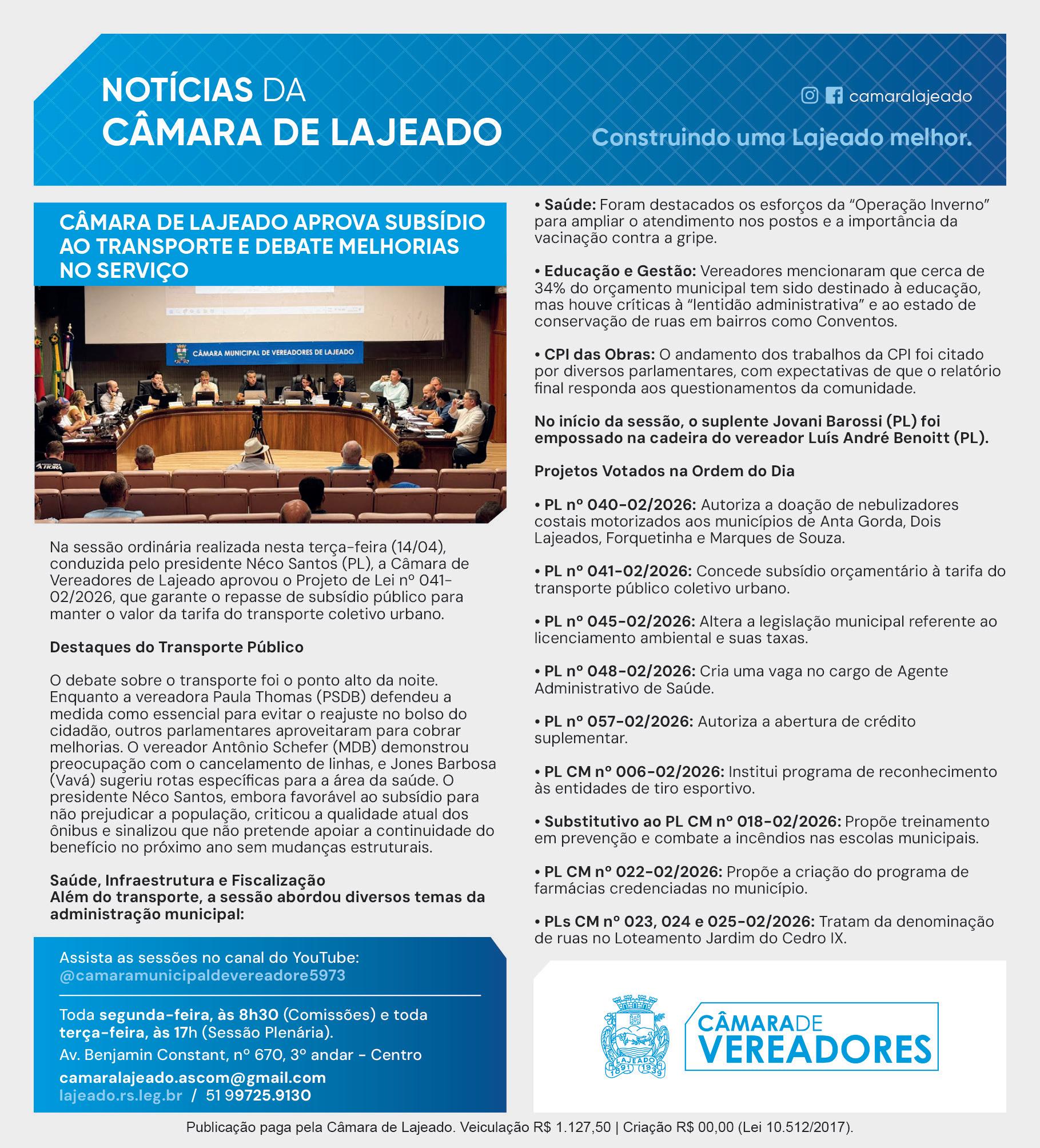 Lajeado aprovou a Lei 12.122, que autoriza a Prefeitura de Lajeado a subsidiar em R$ 1,75 cada passagem de ônibus no transporte coletivo do município. O subsídio reduz o valor final que o usuário paga pela passagem.