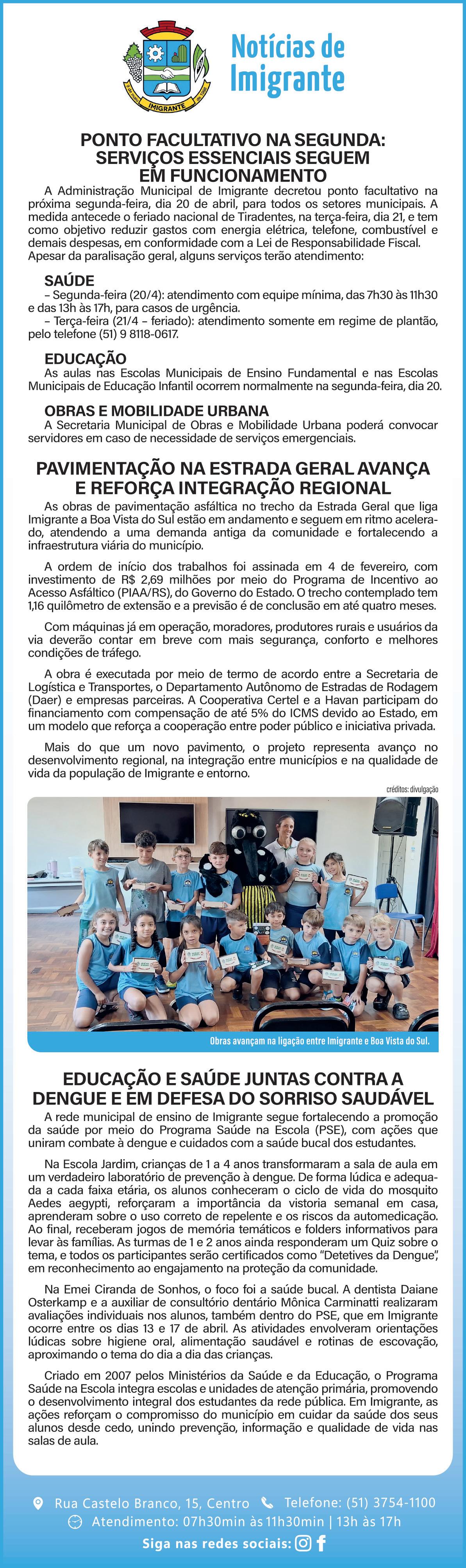 - Governador do RS, Eduardo Leite (PSD) deve retornar ao Vale do Taquari no dia 27. Ele tem uma pré-agenda em Estrela para a inauguração de casas populares. Também está prevista uma visita com inaugurações no município de Venâncio Aires.
