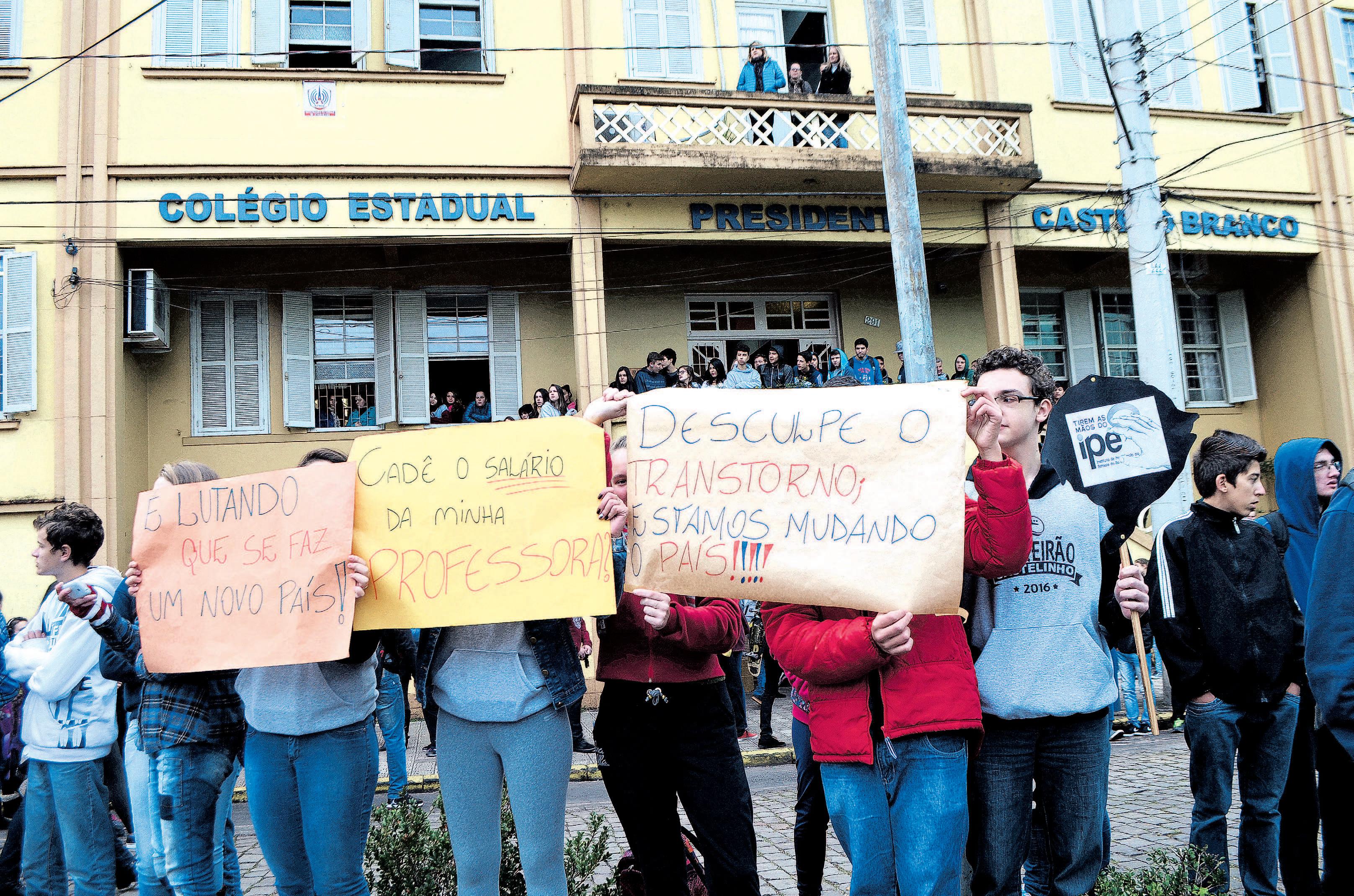 com o parcelamento dos salários. A disputa e o teor das reuniões ou mobilizações públicas ocorrem em torno desses assuntos. Melhorias na qualidade do ensino, novas fórmulas pedagógicas, atualização dos sistemas, entre outros, passam longe da lista de discussões. A ocupação de prédios escolares por alunos, única novidade deste ano, é o resultado do paradoxo que atravessa e se impõe sobre o ensino público do estado e do país. Os protestos de alunos têm efeito cascata. Nascerem no centro do Brasil e se espalham para os mais variados estados. O exercício da cidadania também passa por manifestações, desde que ordeiras e pacíficas. No caso de alunos, podem até resultar positivas se for por poucos dias e tiverem resposta à altura por parte dos gestores. Sobre esse último ponto, não há qualquer garantia. Pelo contrário. O exercício da retórica, com justificativas ocas, soterra a expectativa por soluções pontuais. No RS, temos motivos ainda mais eloquentes para duvidar da nossa capacidade de desenvolvimento. Somos o estado com o maior índice de reprovação do Ensino Médio e estamos entre o seleto grupo de governos que não paga o piso nacional do magistério – que nem é expressivo. Essa incompatibilidade salarial confronta, todos os anos, o Cpers e o governo do Estado. Agora, o parcelamento dos salários é um novo ingrediente.