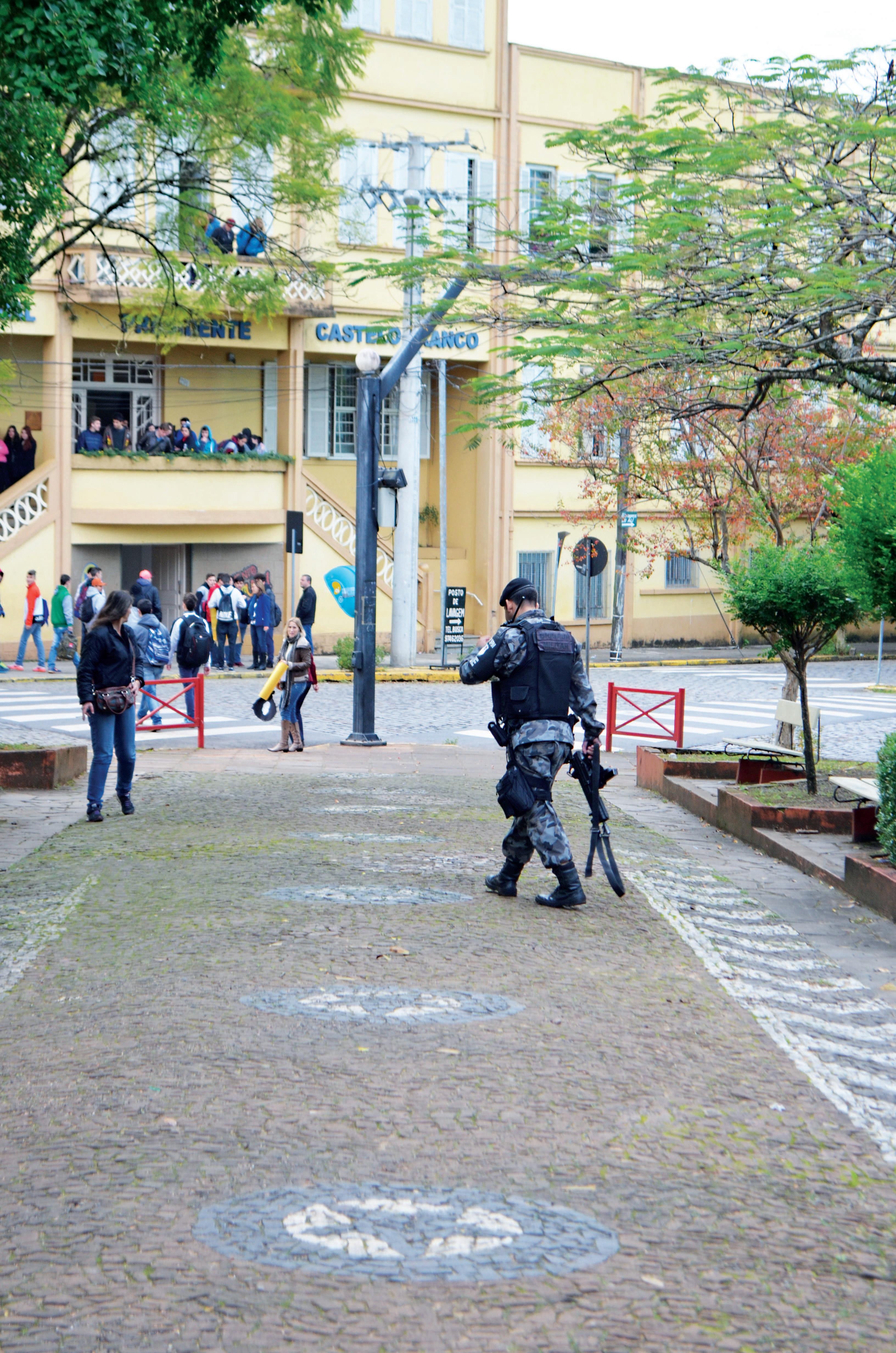PARADOXO: ontem, enquanto alunos protestavam em frente ao colégio Castelo Branco, em Lajeado, um policial circulava entre os manifestantes com uma arma de alto calibre, assustadora e intimidadora. Precisava?