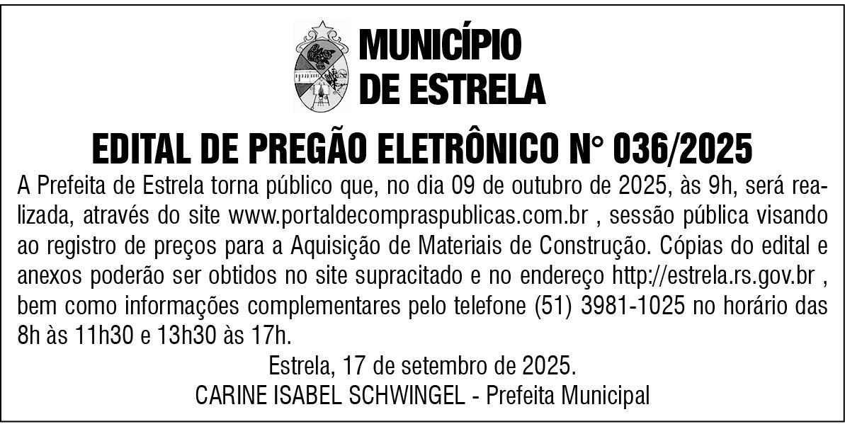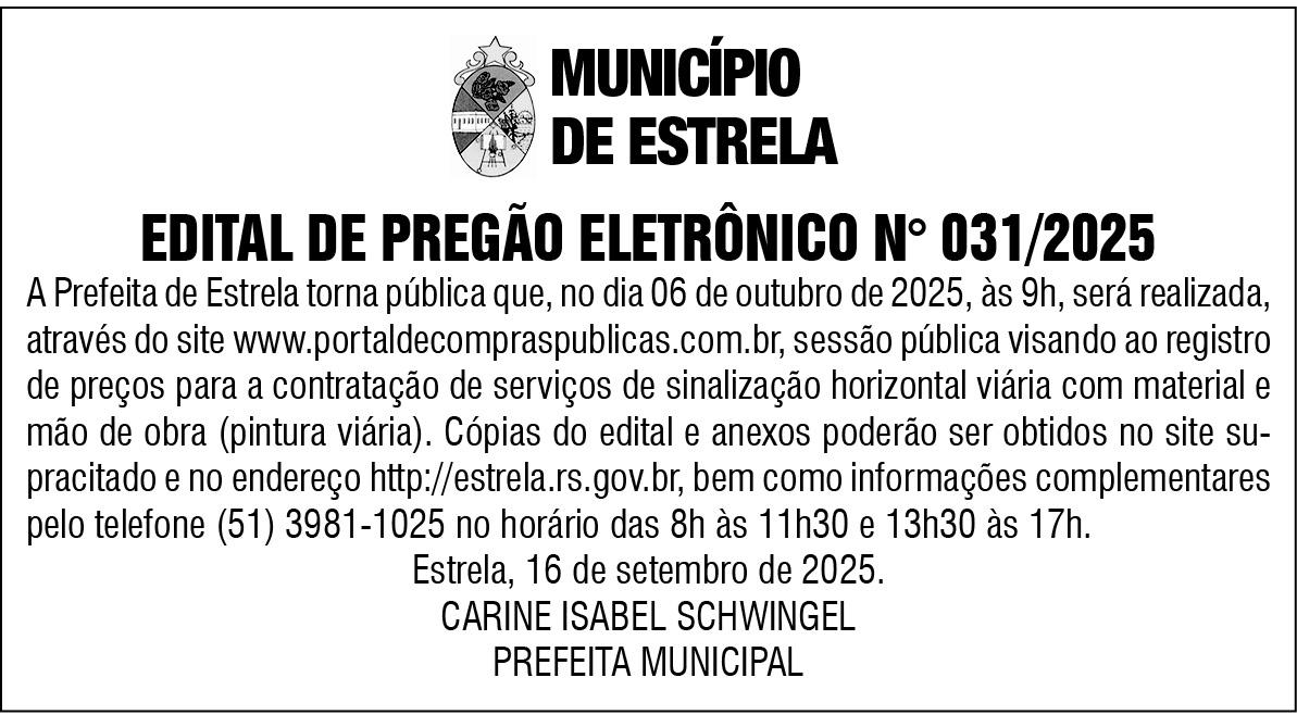 - Em Estrela, o vereador Valderês da Rosa (PSD) solicitou licença de 30 dias, a contar de 1º de outubro, para tratar de assuntos particulares. Durante o período, a cadeira deve ser ocupada pelo suplente Chicó Lehnen (PSD). Da mesma forma, Magdiel Turatti (PSD) deve em breve ceder espaço temporário para a suplente Sabrina Scheer (PSD).