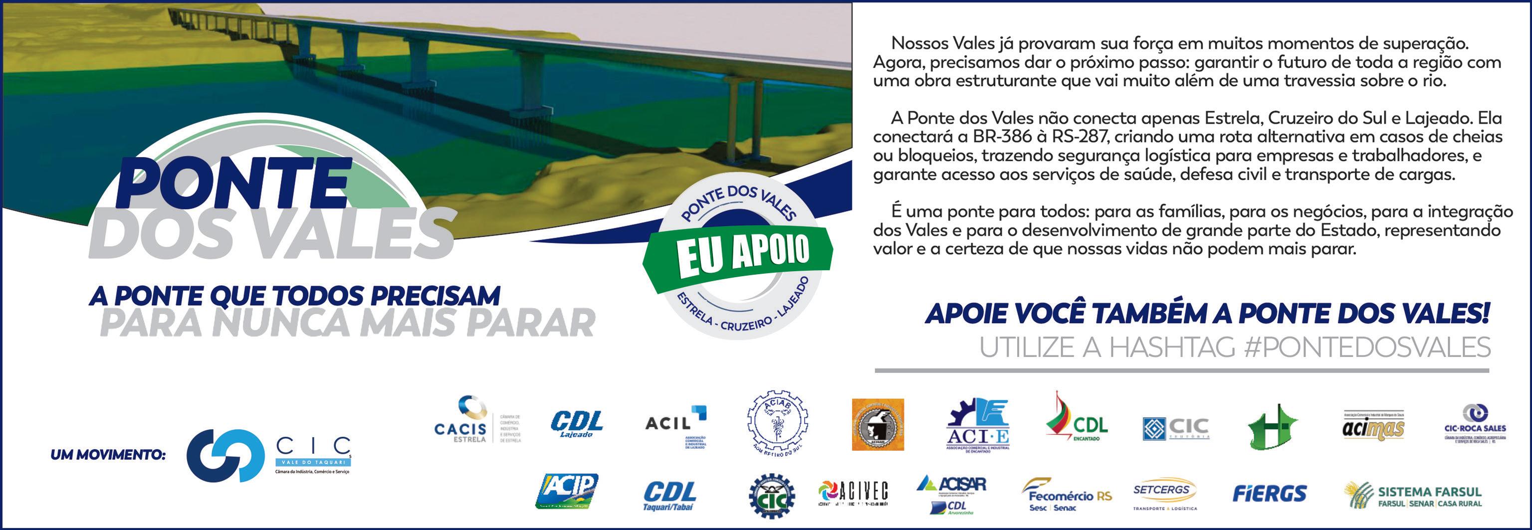 OVale do Taquari será outro a partir da concretização de um sonho antigo, estratégico, e concretado com a força do nosso associativismo. O anúncio da construção de uma nova ponte sobre o Rio Taquari, entre Estrela e Cruzeiro do Sul, ficará registrado nos livros de história como um dos divisores de água da nossa região. É uma conquista de muitas mãos, reforço. E envolveu agentes do presente e do passado, já que a proposta não é uma novidade dentro dos gabinetes do Departamento Autônomo de Estradas de Rodagens (Daer). Pelo contrário. O projeto de