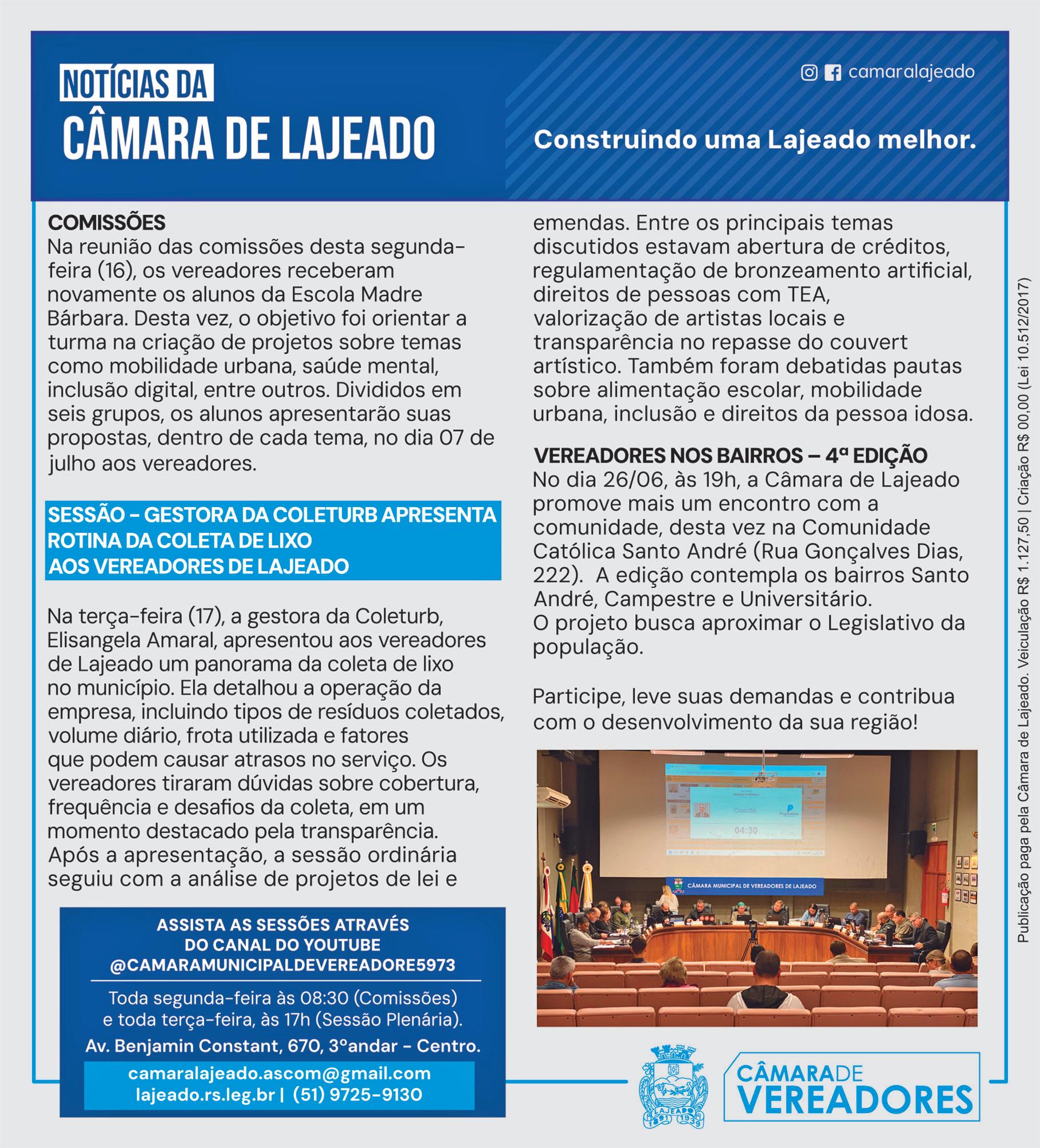 - Os vereadores Jonas Vavá (MDB) e Rosane Cardoso (PT) serão os representantes do Legislativo de Lajeado na comissão organizadora da Conferência Municipal das Cidades, que ocorre hoje, a partir das 8h, no CTG Raízes do Sul. Pelo Executivo lajeadense, os representantes são Alex Schmitt, secretário da Seplan, e Francini Ledur, chefe de gabinete.