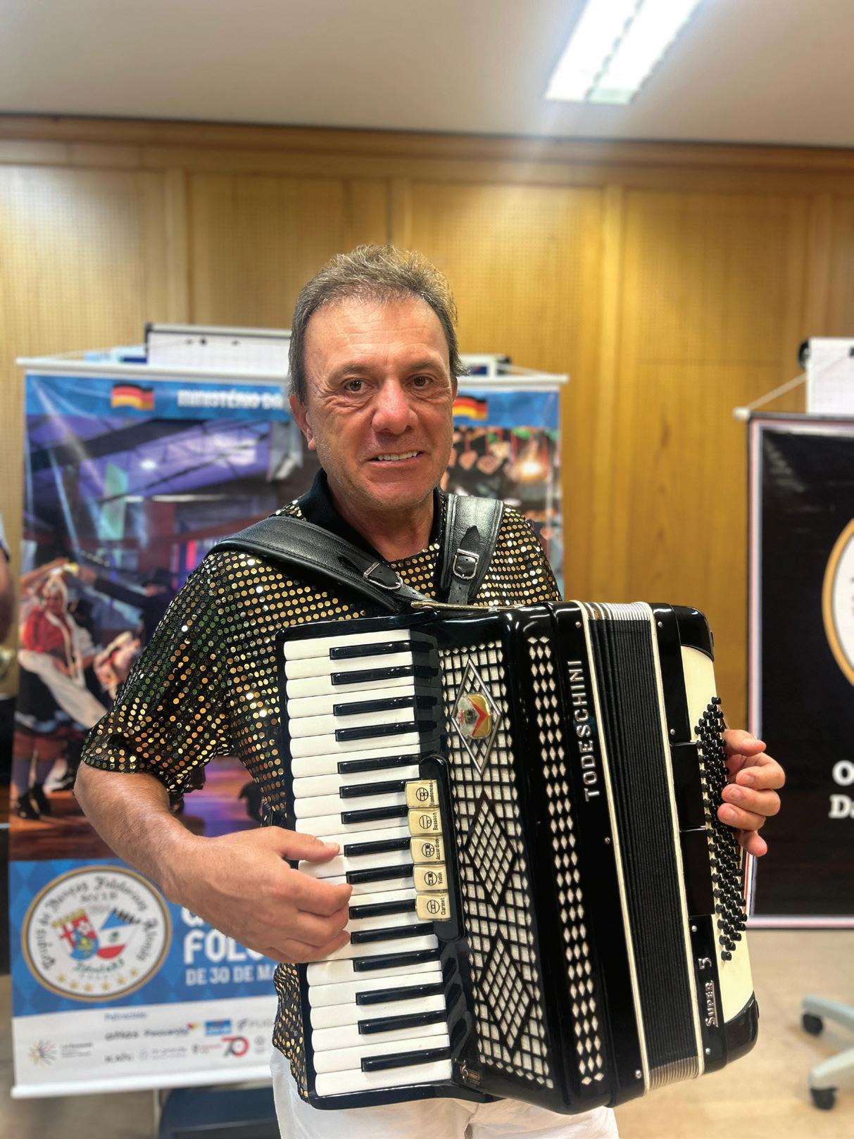 Pela terceira vez, Guido Collet,65,acompanha osGruposFolclóricosde Estreladuranteturnêpela Europa.Desdeos16anos inserido no mundo da música,elefazparteda bandaresponsávelpela partesonoradoespetáculo pelaAlemanha,Áustria e Eslovênia. Ao lado dos colegas,Guidotocagaita etambémparticipada coreogra acomoutros instrumentos.Aprimeira experiênciaemturnê ocorreu em 2008