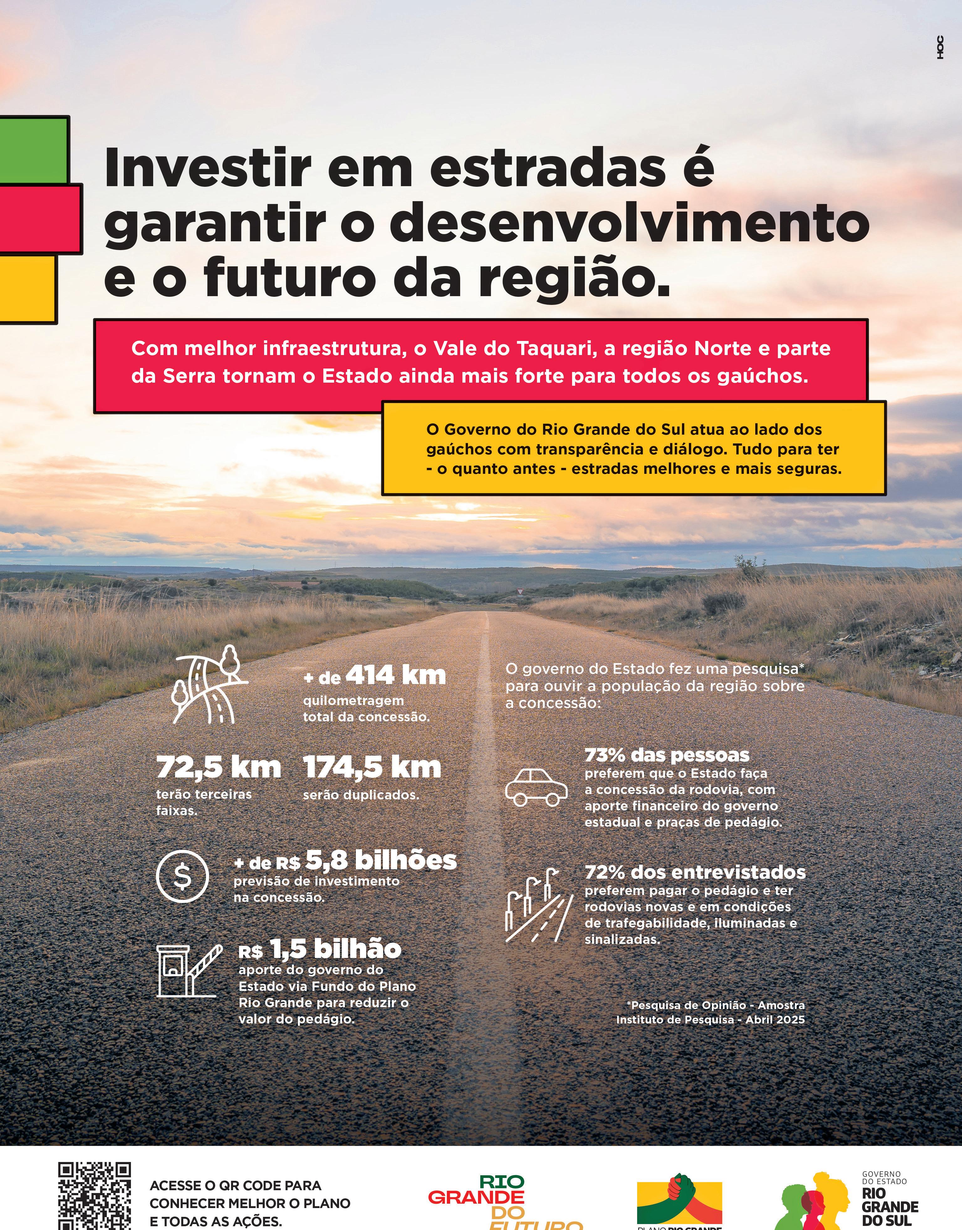 timentos na malha rodoviária gaúcha. Há quem acredite que o próprio Estado têm condições de arcar com essa conta. E eu até concordo que a responsabilidade deveria ser do mesmo ente que tantos impostos recolhe do cidadão. Mas, e olhando para o mundo real, onde a matemática simples comprova as dificuldades históricas do Estado nas áreas da saúde, da educação e da segurança pública, eu não tenho como acreditar em uma solução à segurança viária por parte do Estado. Por fim, jamais deveríamos admitir que se transforme um tema tão importante (e óbvio) em um palanque político. Muito menos em um circo.