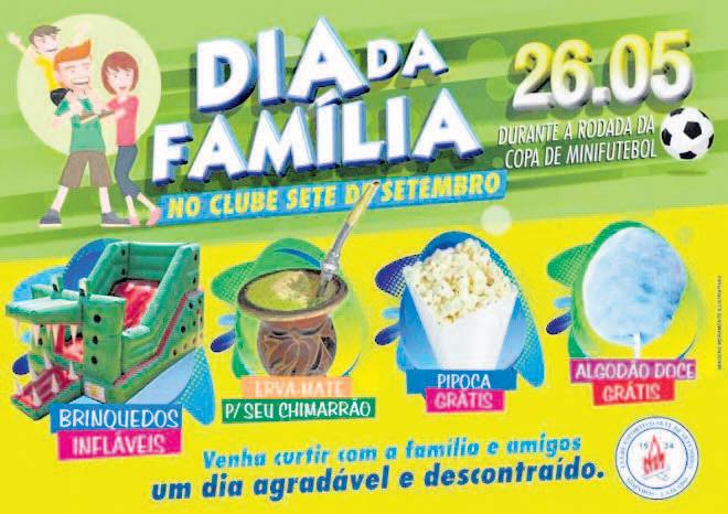 O Clube Sete de Setembro realiza no feriaado de quinta-feira, 26, o Dia da Família. Serão oferecidos brinquedos infláveis, erva-mate, pipoca e algodão-doce.