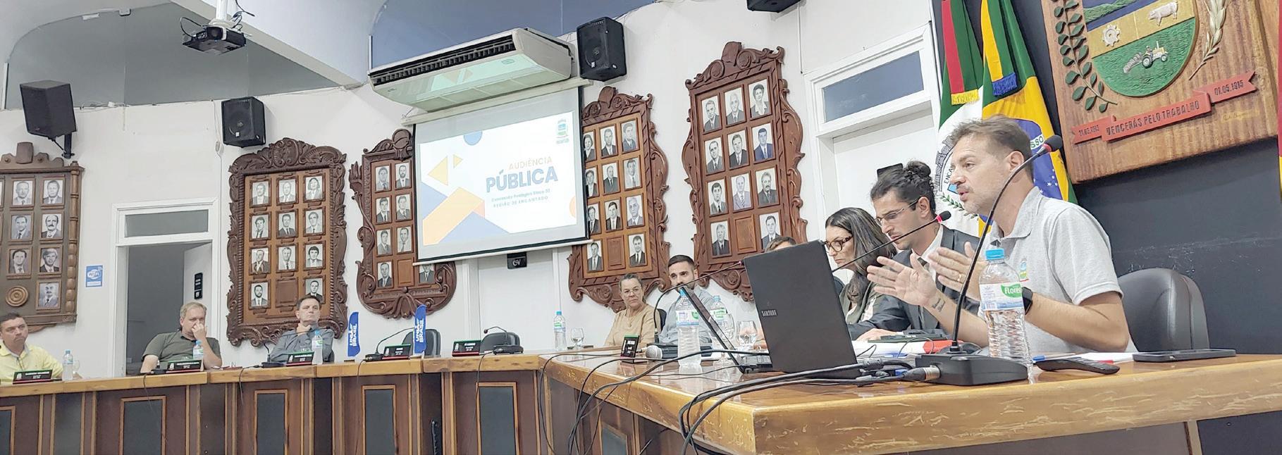 Oplano de concessão das rodovias do Vale do Taquari foi pauta de audiência pública na terça-feira, 18, em Encantado. A iniciativa da Câmara de Vereadores buscou detalhar o cronograma e os projetos de obras (trechos de duplicação, acostamentos, vias laterais, rótulas e passarelas) que abrangem as rodovias que cruzam o território encantadense, além dos impactos financeiros com a implantação da cobrança de pedágio pelo sistema free-flow. A condução do debate foi do vereador Daniel Passaia (União Brasil), presidente da Comissão de Constituição e Justiça (CCJ), proponente da audiência. O prefeito de Encantado, Jonas Calvi (PSDB), avaliou que houve avanços no projeto em relação à proposta anterior, apresentada pelo governo estadual em 2022, e lembrou que a comunidade busca um modelo justo. “Ninguém gosta de pagar o pedágio. A concessão está aí. São várias obras. Se tem alguém que foi penalizado é Encantado e região alta. Não venham se usar de Encantado e fazer demagogia política. Há