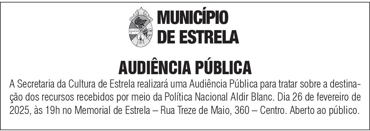A- A câmara de Estrela convoca a comunidade para acompanhar audiência pública no dia 24 de fevereiro, a partir das 17h45min, na sede do Ceiteq, instalada no antigo prédio da Polar. Em debate, a “avaliação e verificação do cumprimento das Metas Fiscais do Município de Estrela referente ao 3º quadrimestre de 2024”. A audiência também será transmitida pelo YouTube do Legislativo.