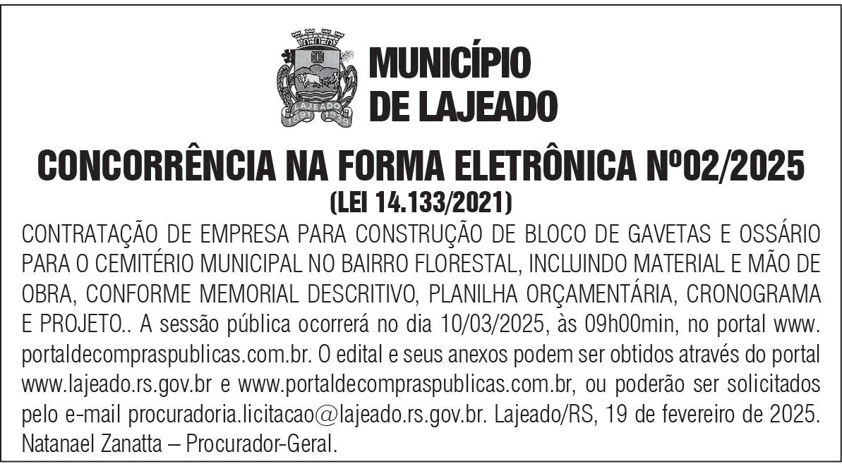 - Já o governo de Lajeado anuncia para o dia 12 de março a sessão pública para a construção da nova Unidade Básica de Saúde (UBS) no bairro São Cristóvão. De acordo com o edital de licitação, os recursos são do Ministério da Saúde.
