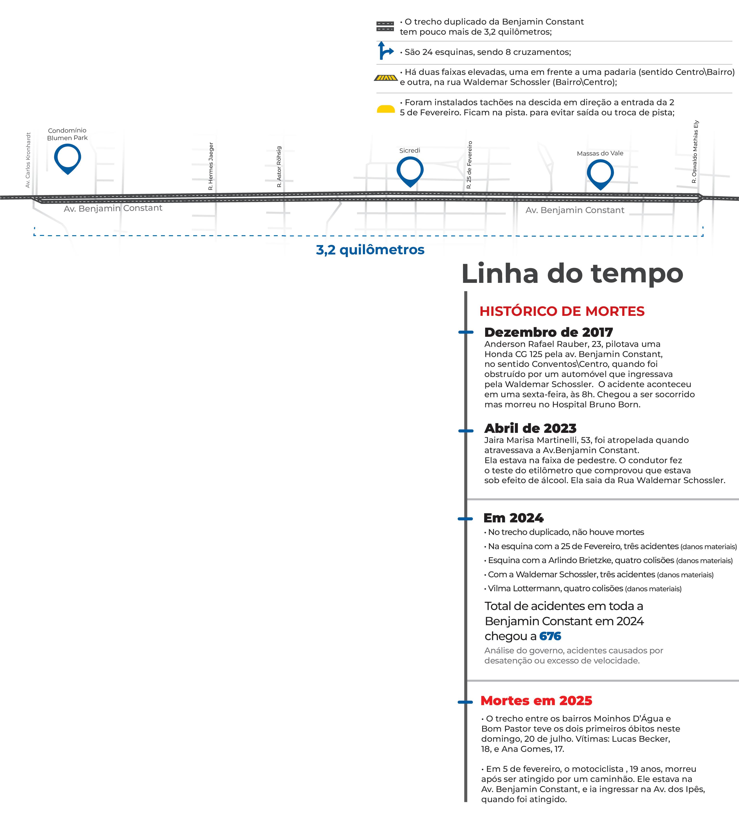 A Av. Benjamin Constant, palco da tragédia, sintetiza os desafios: trecho com topografia acidentada, 24 cruzamentos em apenas 3,2 km e um fluxo intenso de veículos que transformam cada esquina em ponto de risco.