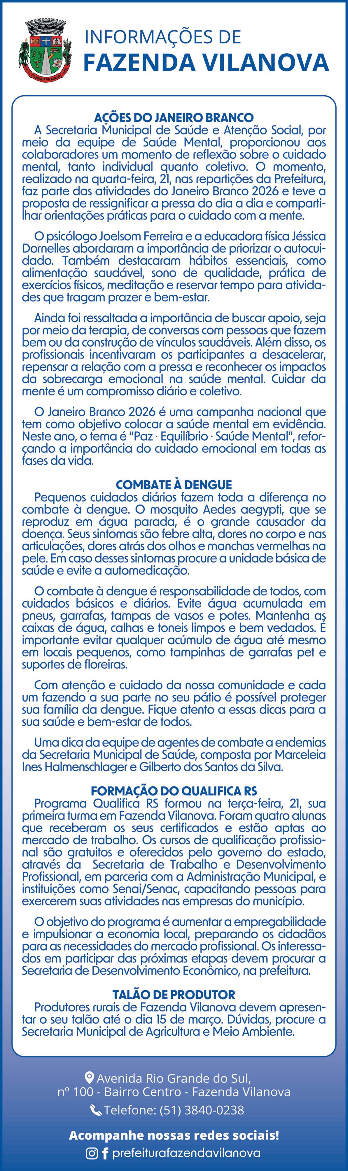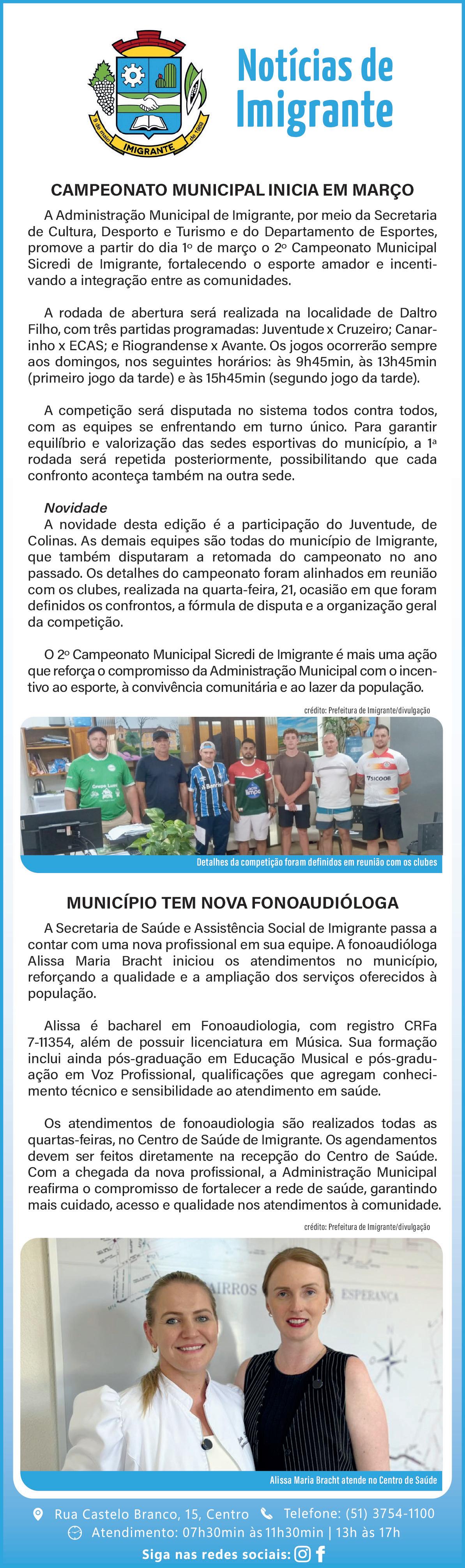 - Cotado para assumir a Secretaria de Agricultura e Obras de Encantado, o vereador Leonardo Lorenzi (MDB) declinou do convite do prefeito Jonas Calvi (PSD) e sugeriu que o vice-prefeito Agostinho Orsolin (MDB) assuma tal função.