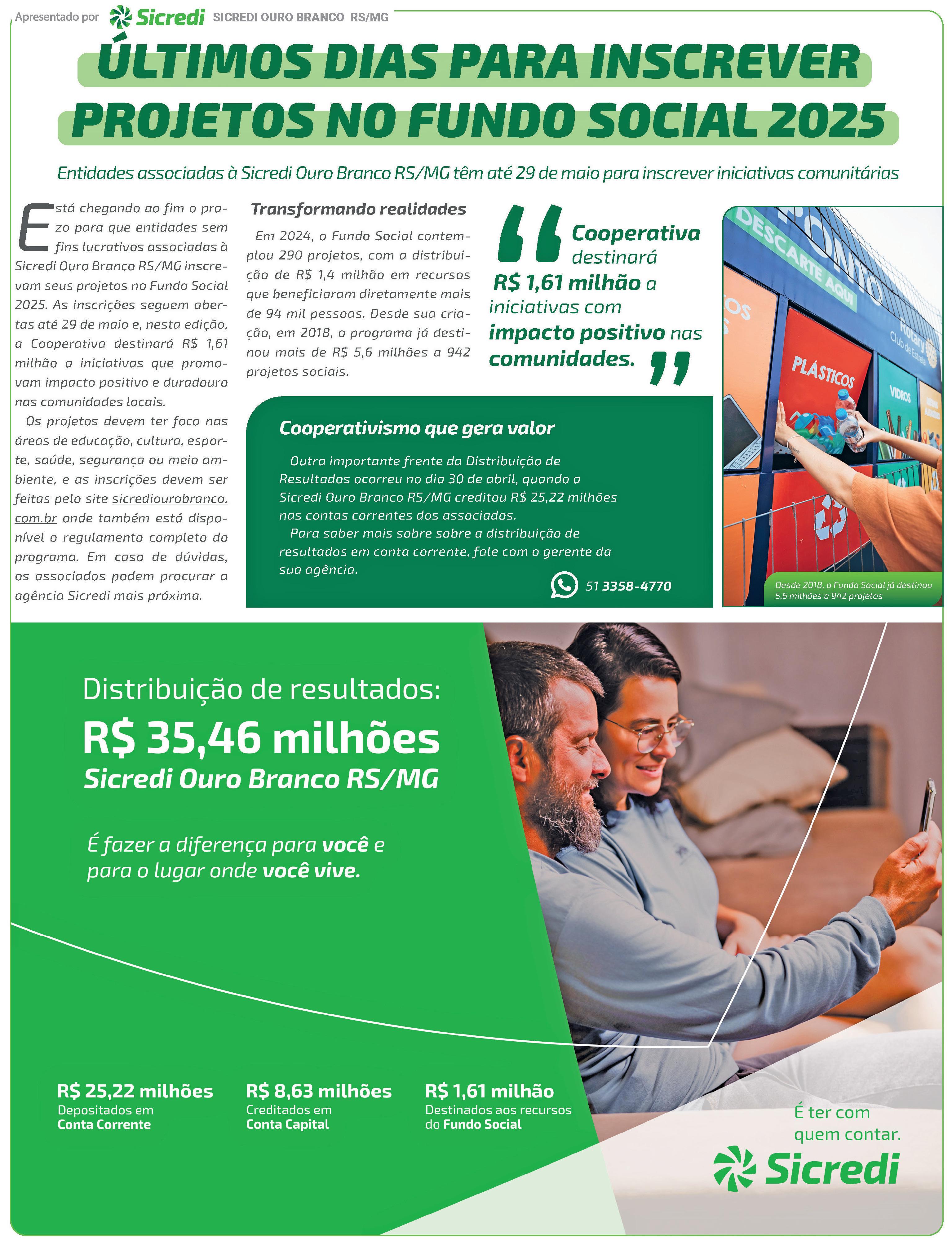 A Sicredi Ouro Branco RS/MG inicia na próxima semana o projeto “Sicredi na Comunidade”, com eventos em todos os municípios onde atua no RS e MG. A iniciativa reforça a proximidade com os associados e a transparência da cooperativa, que apresentará seus resultados e impactos sociais e econômicos na região. As reuniões