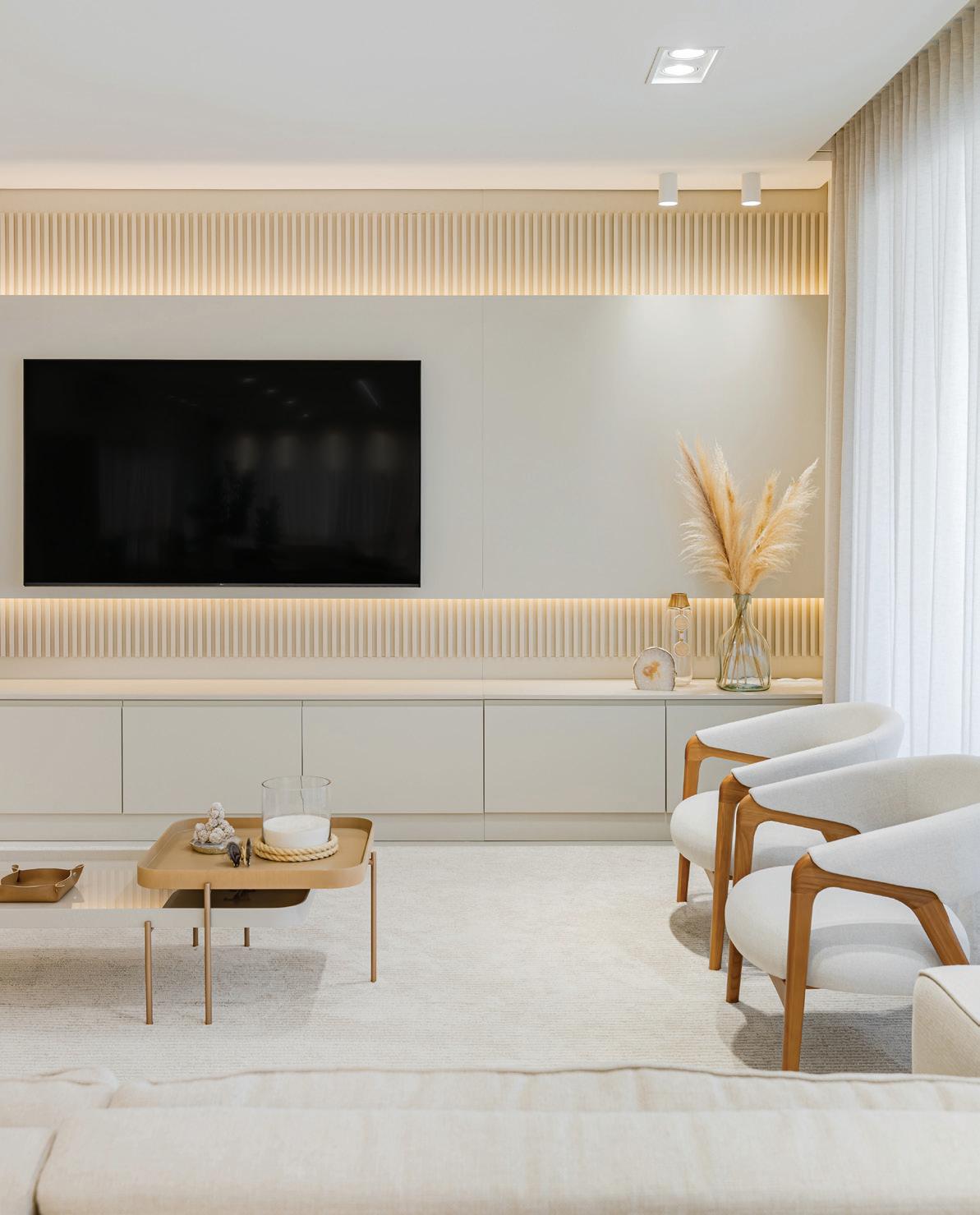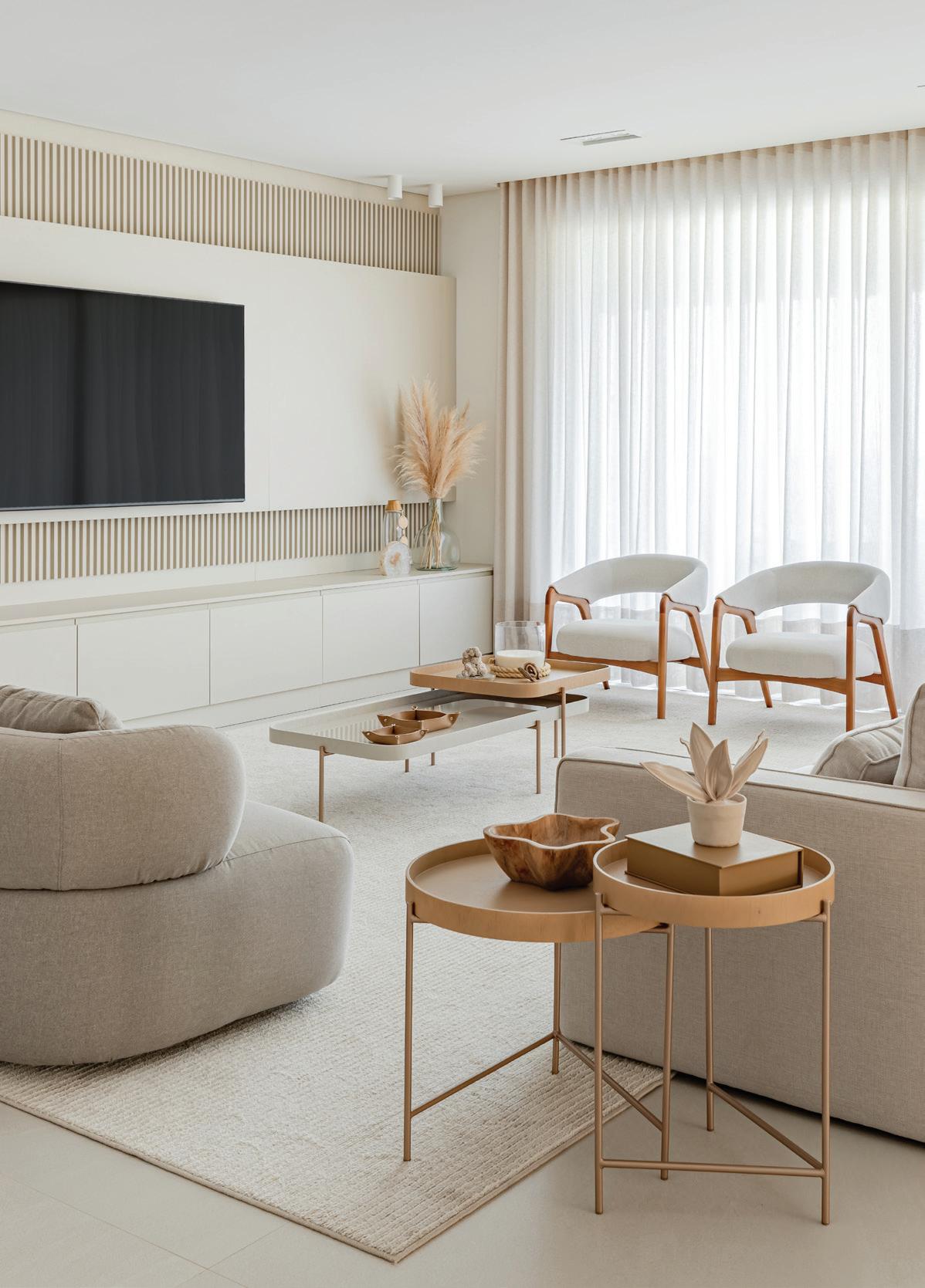 Leveza, sofisticação e fluidez, sem perder a funcionalidade de um living integrado. Essa foi a premissa do projeto da arquiteta Janaína Kuhn. Segundo a profissional, os ambientes possuem composição espacial coesa e harmônica, marcada por uma paleta de cores neutra, combinada por tons off-white, areia e nuances amadeiradas, com materiais que reforçam a sensação de acolhimento e elegância. O layout foi pensado para promover o convívio familiar. Assim, há total integração entre a sala de estar, de jantar e espaço gourmet. No estar com TV, a escolha por revestimentos texturizados, como o painel com ripado e a pedra natural no volume da lareira, adiciona camadas à composição e confere detalhes ricos à uma base neutra.