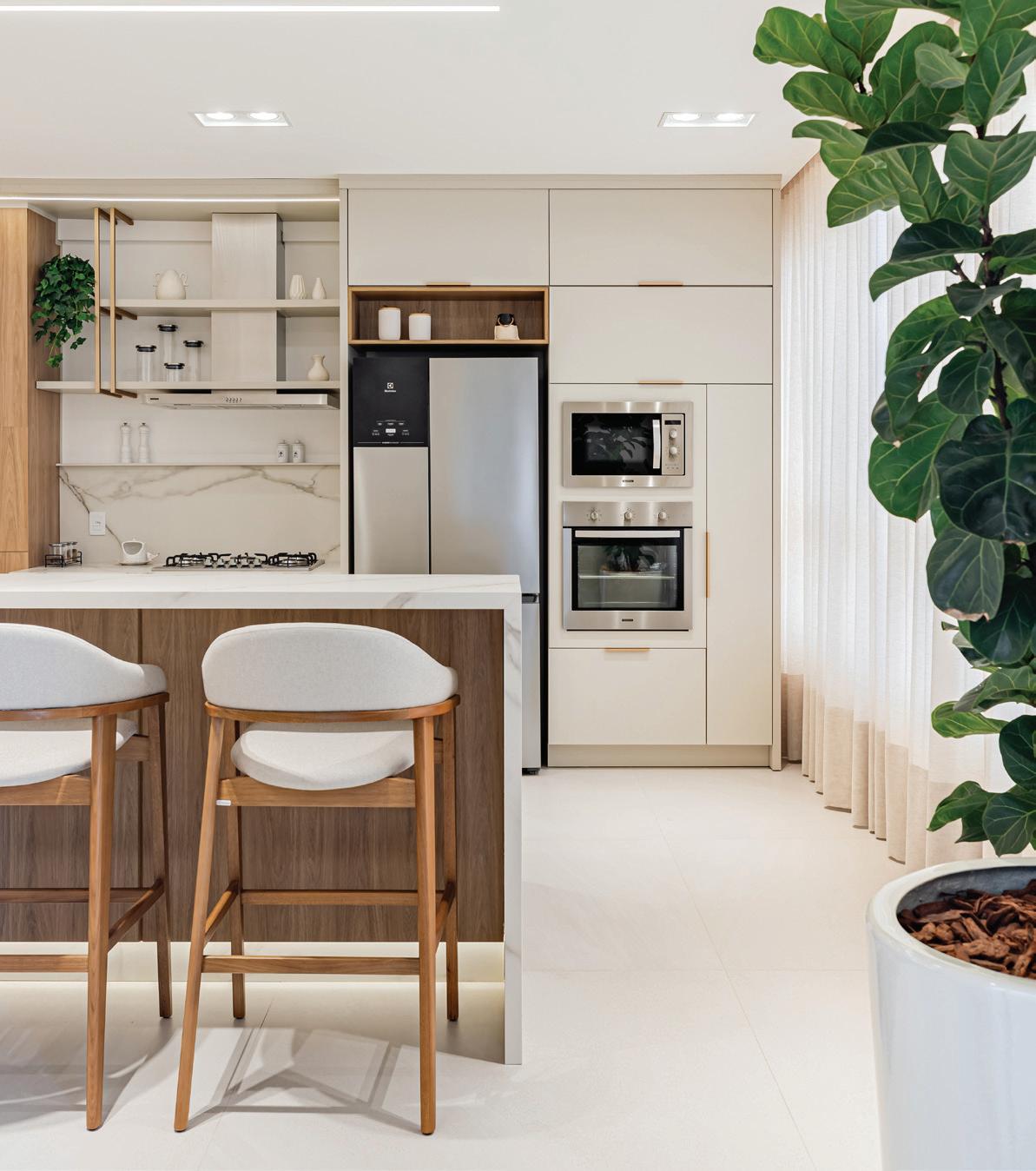 Segundo Janaína, a área gourmet se organiza a partir de uma grande ilha central, e, no entorno, são organizados utensílios e eletrodomésticos, além da churrasqueira, bar e cristaleira. Com amplas aberturas, a iluminação natural permeia os espaços. Para controle da incidência solar, os tecidos leves e fluídos das cortinas