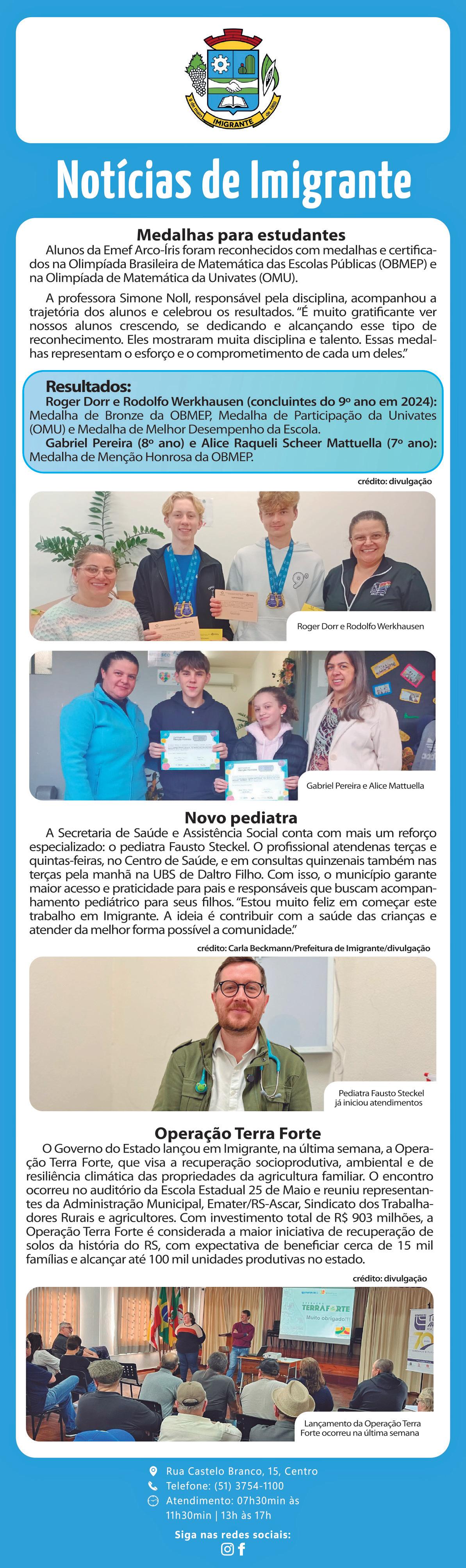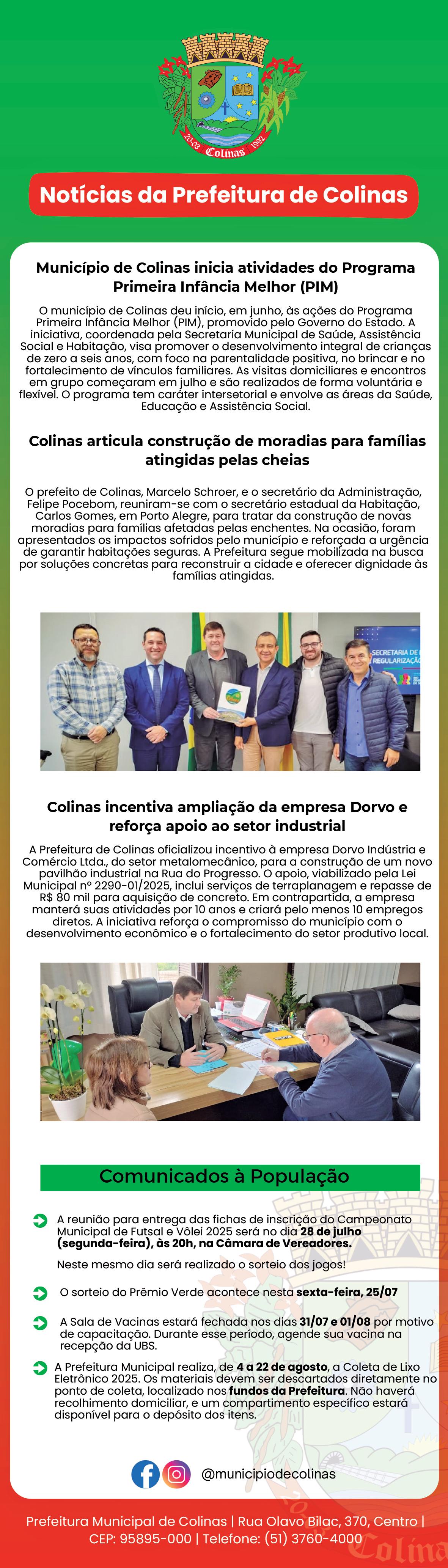 Colinas deu início às atividades do Programa Primeira Infância Melhor (PIM), política pública promovida pelo Governo do Estado. A ação está sob responsabilidade da Secretaria Municipal de Saúde, Assistência Social e Habitação, com apoio de outras pastas. O programa é voltado à promoção do desenvolvimento integral de crianças desde a gestação até os seis anos de idade. No primeiro mês, a profissional Cândida Thaminne Trentini Dannebrock atuou na formação inicial e na organização dos processos de trabalho, em parceria com o Grupo Técnico Municipal (GTM). Em julho, começaram as visitas domiciliares e os encontros em grupo com gestantes e famílias com crianças da faixa etária aten-