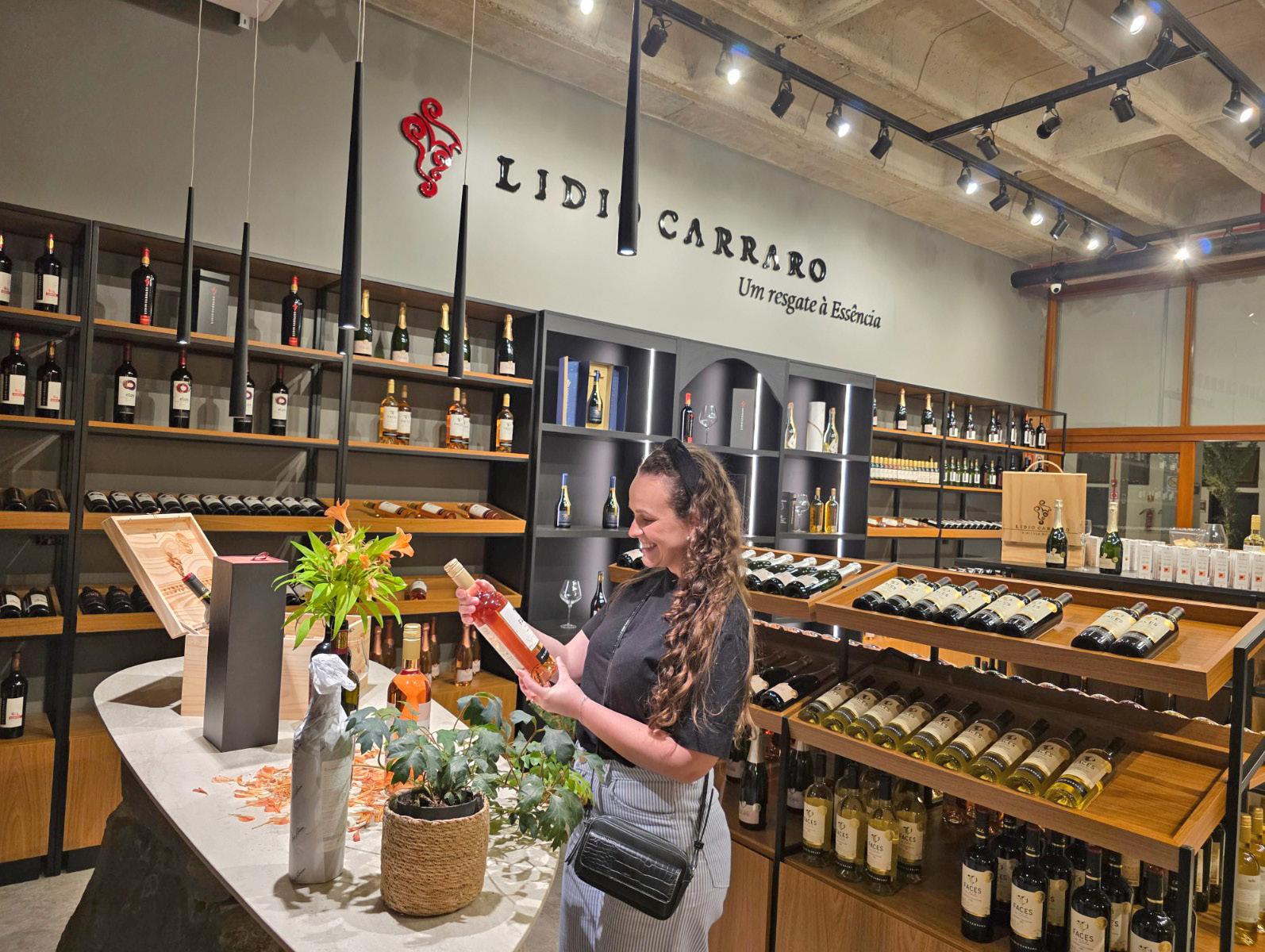 Estruturas metálicas iluminadas evidenciam garrafas especiais, enquanto a cristaleira exibe taças e peças decorativas