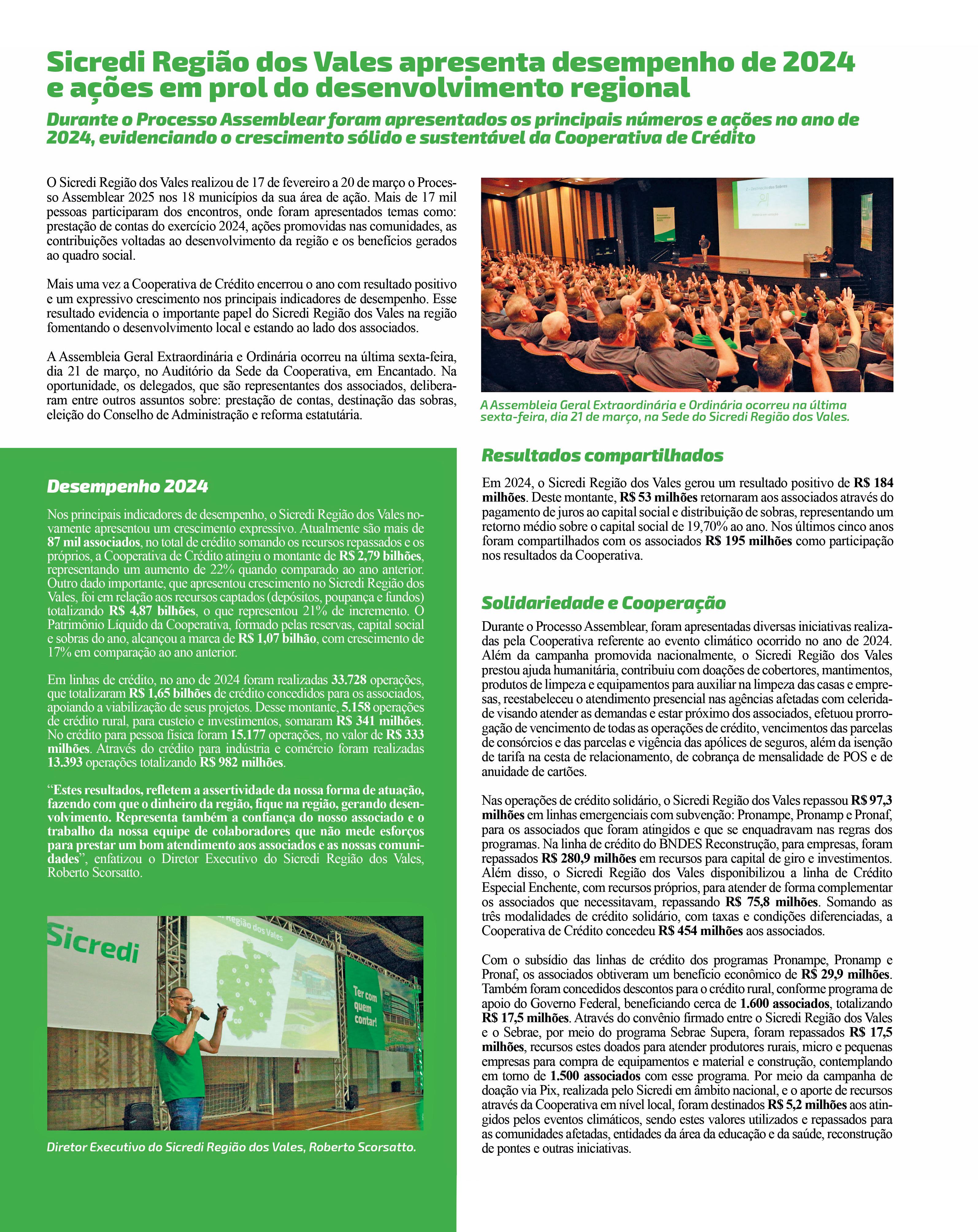 Após as catástrofes climáticas que atingiram o Vale do Taquari, o Sicredi destinou R$ 8 milhões em doações e liberou mais de R$ 500 milhões em créditos para reconstrução, com 1.830 contratos firmados.