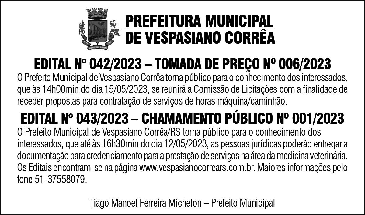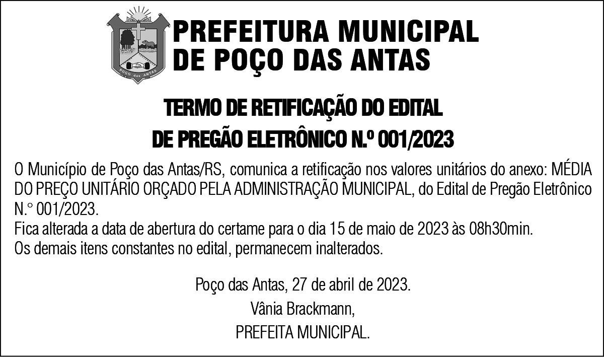 • O governo de Lajeado comunica a suspensão do registro de preço para “aquisição, sob demanda, de equipamentos de hidratação tipo totem, com dispensação de água quente e fria, a serem instalados em espaços públicos”.