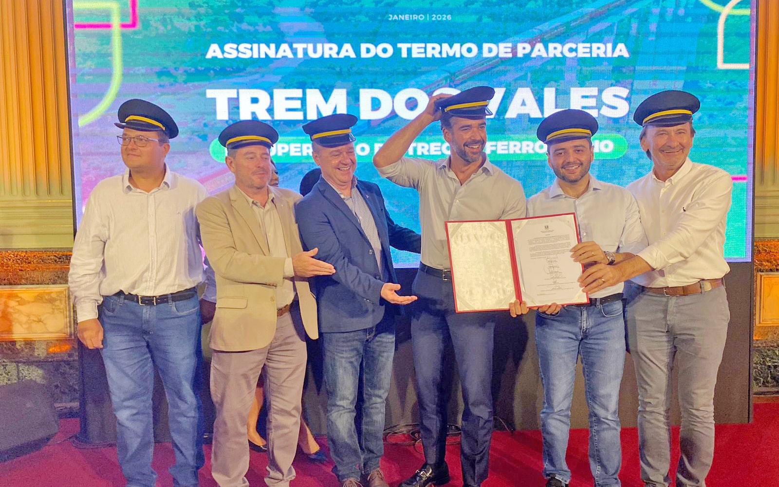 O governo do RS assinou ontem o termo que marca o início da recuperação do Trem dos Vales. A cerimônia no Palácio Piratini oficializou o repasse de recursos para a reconstrução do atrativo turístico. O acordo formaliza a cooperação entre o governo estadual e a entidade responsável pelo projeto.