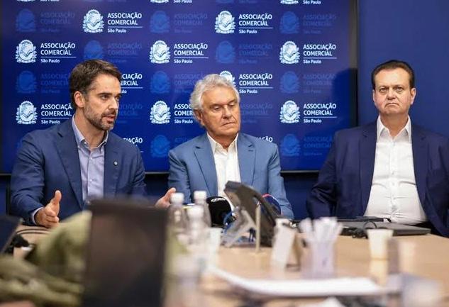 Eduardo Leite ao lado de Ronaldo Caiado e do presidente do PSD, Gilberto Kassab. Confirmação do précandidato aproxima sigla do conservadorismo