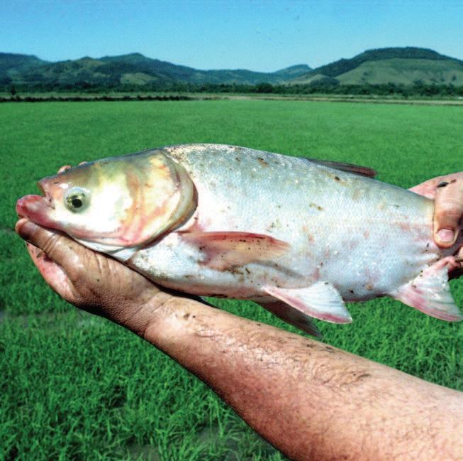 água, transformando-se em um açude, onde os peixes permanecem sete meses até o período da nova semeadura, alimentando-se de restos de culturas. “Com um manejo adequado e um pouco de alimentação suplementar, o produtor pode tirar cerca de sete t/ ha de peixe.”