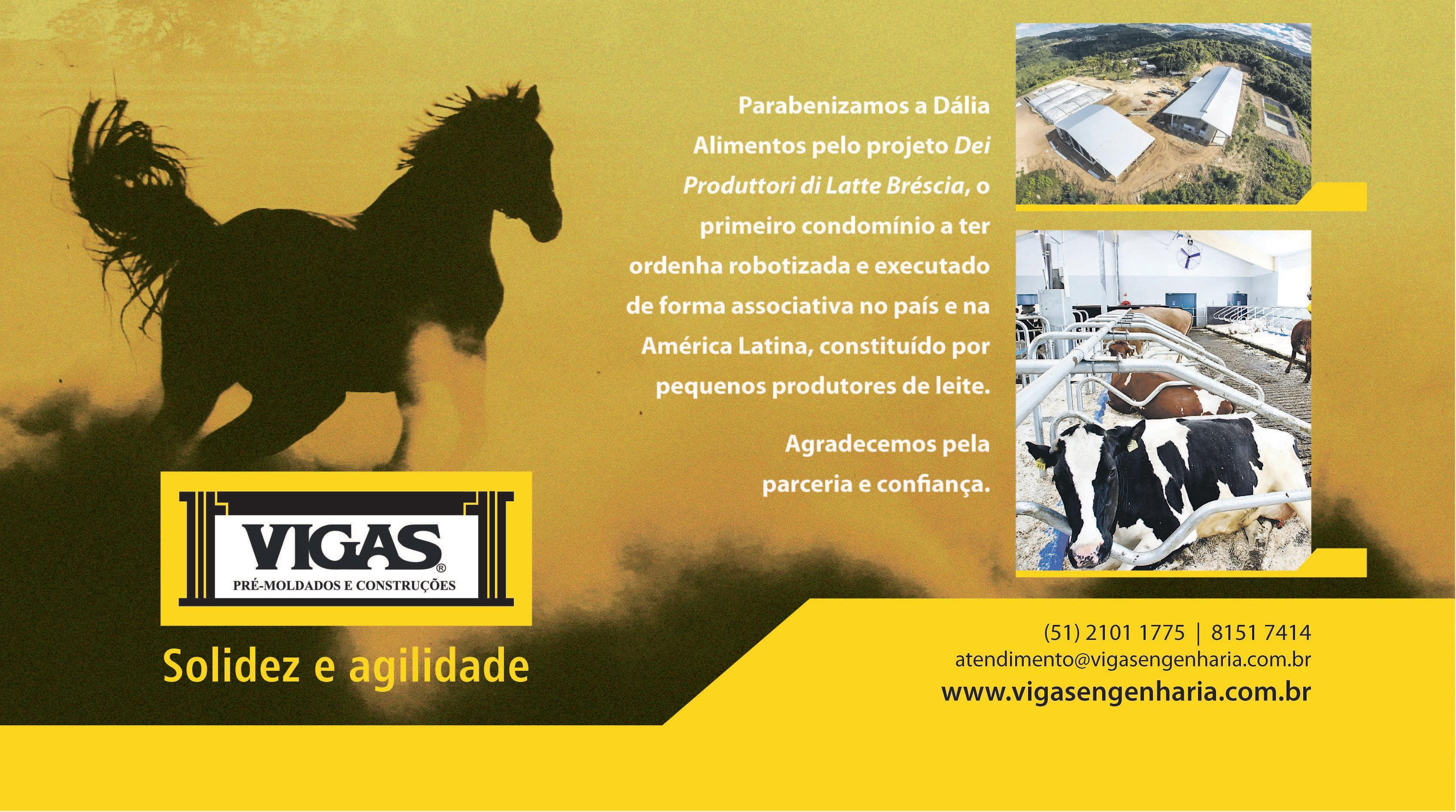 Dália Alimentos aplicará R$ 20 milhões na construção de quatro condomínios leiteiros. A primeira estrutura foi inaugurada neste mês, em Nova Bréscia, com capacidade para 262 animais. São 16 famílias associadas. Sistema operado por robôs eliminará trabalho braçal, qualificará o processo produtivo e amenizará a falta de mão de obra.