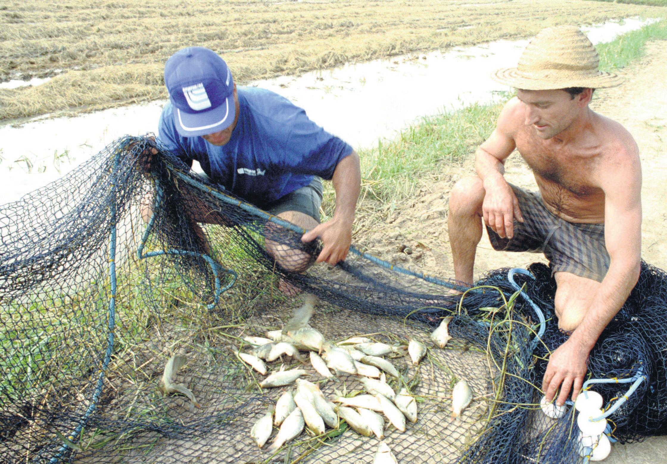 A rizipiscicultura, a criação de peixes consorciada com a cultura de arroz irrigado, ganha espaço nas lavouras e aumenta os lucros. Atividade foi implantada no estado faz dez anos. Por ciclo, produção de pescado chega a sete mil quilos.