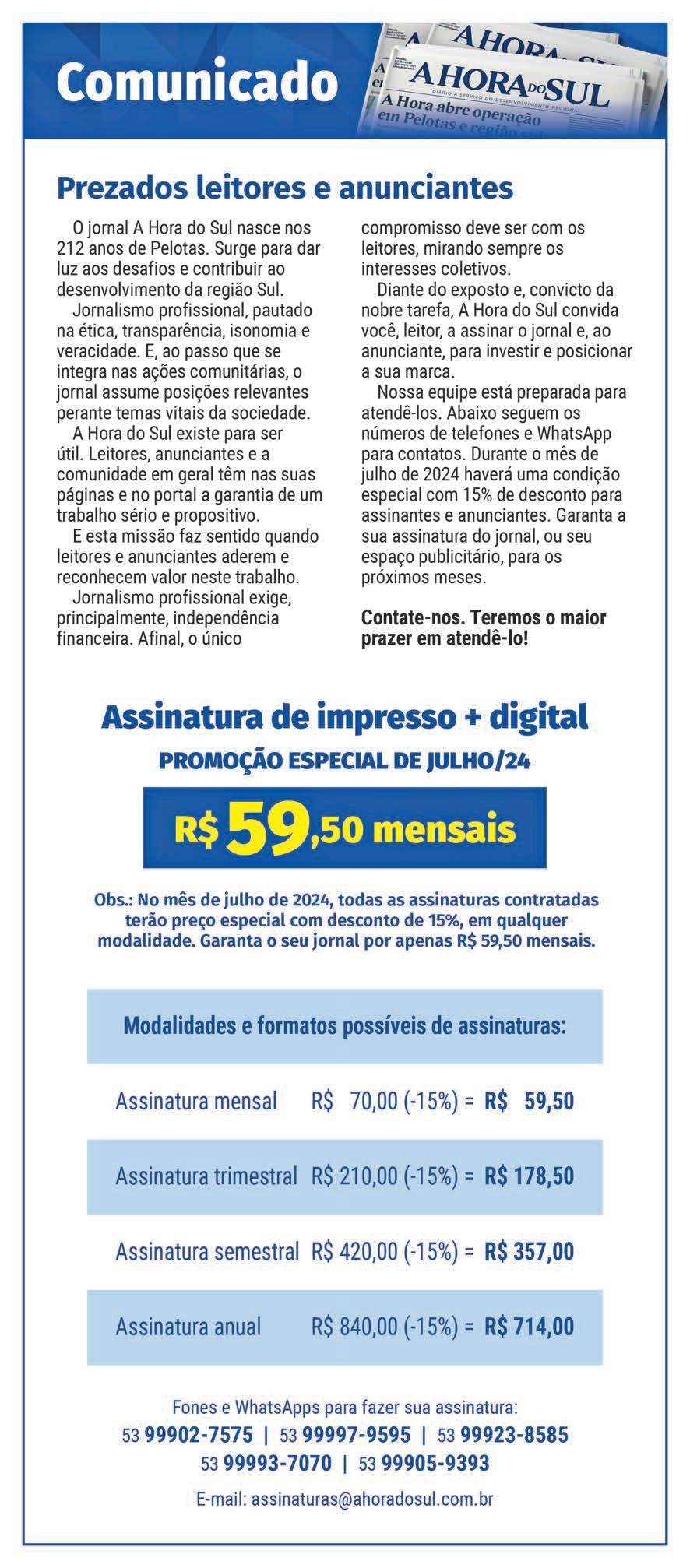Faça sua assinatura: assinaturas@ahoradosul.com.br