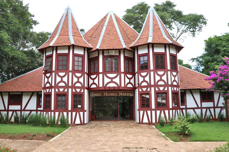 Parque Histórico | Bairro Alto do Parque Concentra 24 construções em estilo enxaimel, um pequeno lago, coreto e estrutura para a prática de Eisstocksport.