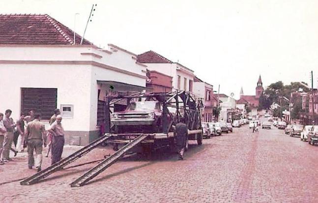 A revendedora Brucom nos anos 1970, na esquina entre as ruas Júlio de Castilhos e Pinheiro Machado