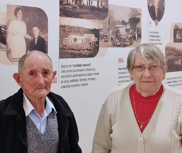 Verno, 86 anos e Marlise Kronbauer, 80 anos, no lançamento da Santa Flor. Eles moram a poucos metros da fumageira, transformada em Parque de Eventos Broenstrup, e recordaram dos momentos vividos no local. Trabalharam por cinco anos na fumageira em Picada Santa Clara, local que abrigará o evento no mês de outubro.