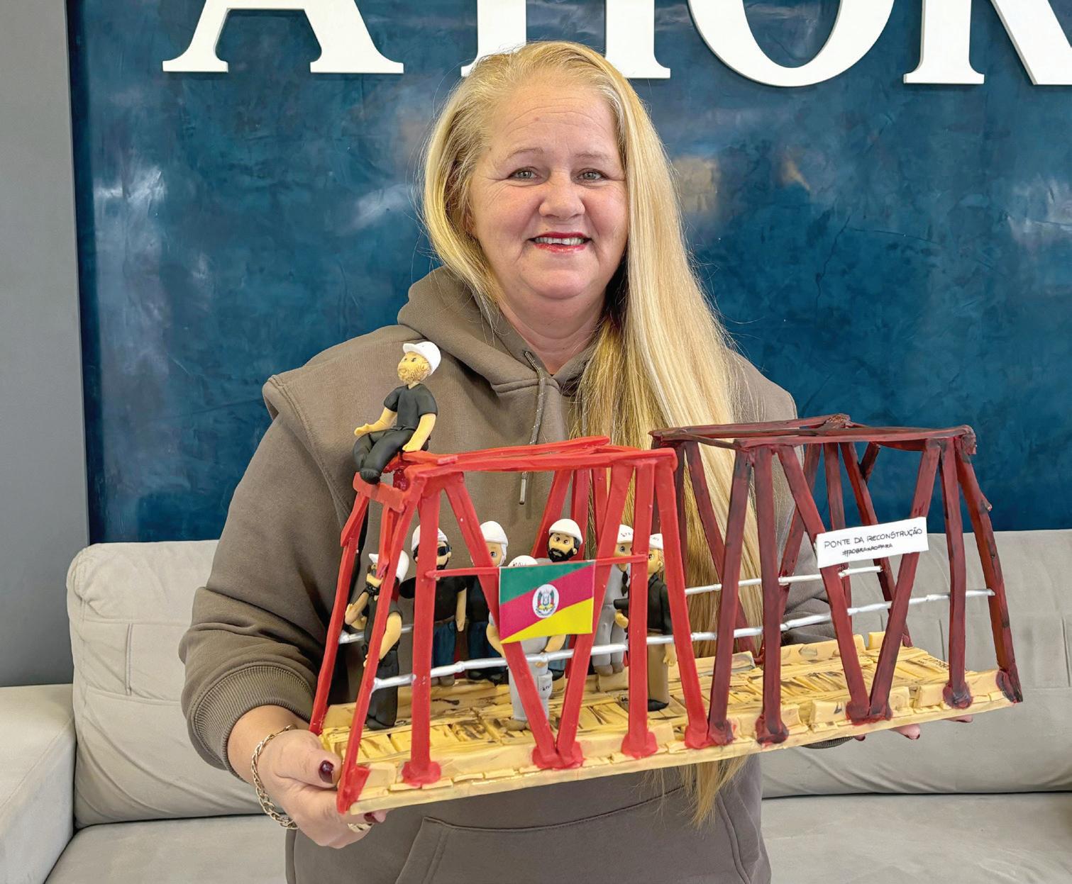 Comovidapelatragédia de maio, a artesã Salete Silva,deLajeado,fez umaréplicadaPonte de Ferro sobre o Rio Forquetacomouma homenagemàiniciativa privadaquerestabeleceu aligaçãoentreLajeadoe ArroiodoMeio.Apeça, presenteadaaodiretor daLyallConstrutora,foi feita em biscuit e mostra aestruturaeaequipe responsávelpelaobra.