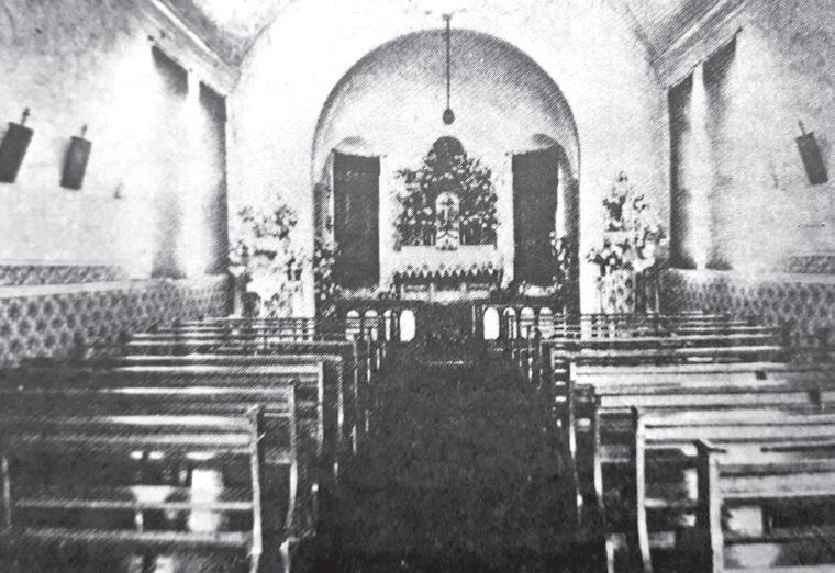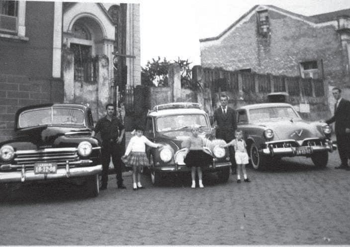 Carros estacionados em frente à capela, na década de 1950. Nesse período, a estrutura foi usada para as missas de Lajeado enquanto a Igreja Matriz era reconstruída depois do incêndio de 1953