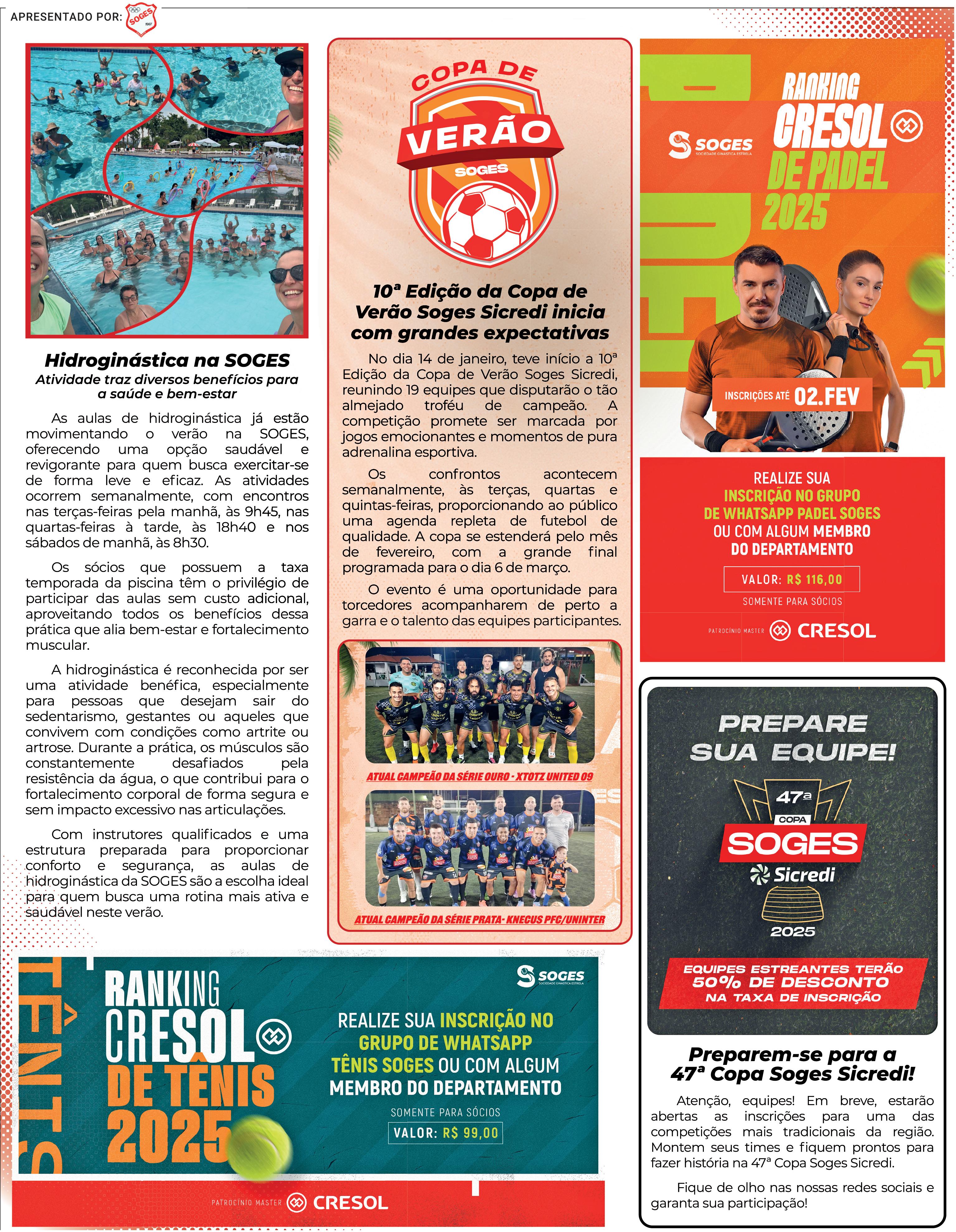 Adécima Copa de Verão da Soges se encaminha para o final da primeira fase com rodada tripla na próxima semana. Os jogos ocorrem na terça, quarta e quinta-feira. São três partidas na terçafeira, 4. ST Ambeve x Brocadores; Sokanelinhas x SPC e Knecus x Xtotz United.